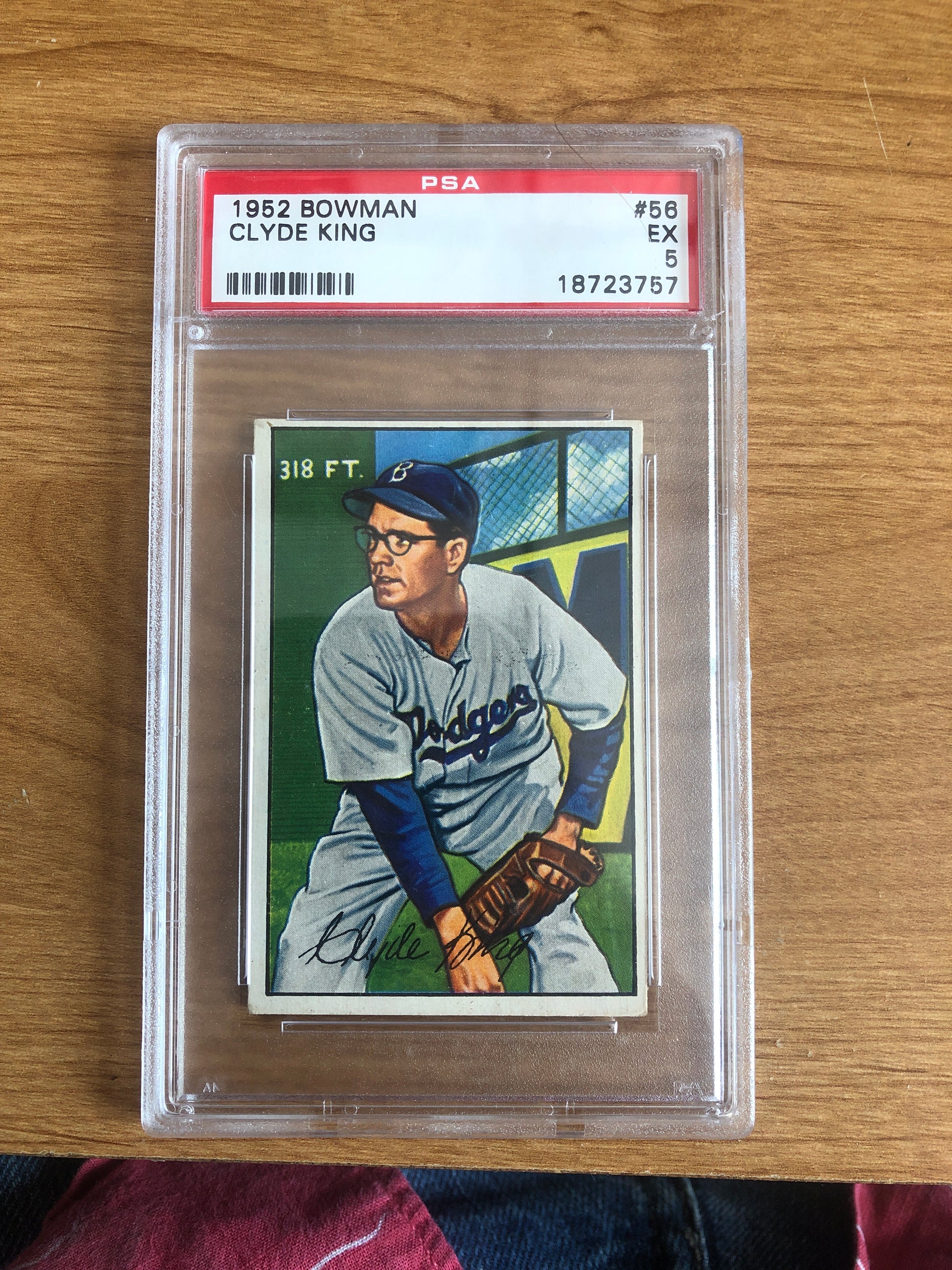 1952 Clyde Bowman Dodger's baseball card. Has been graded a "5" by PSA grading. Card is slightly faded but still mostly vibrant. Enclosed in a solid shell card holder.