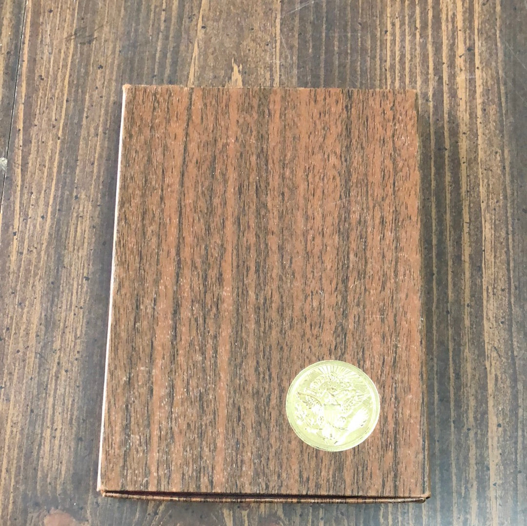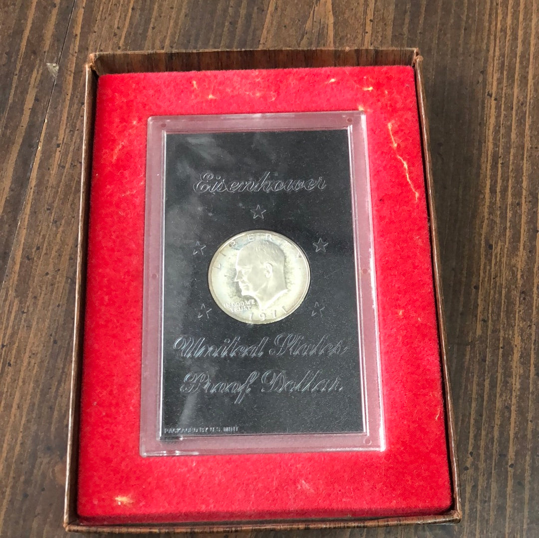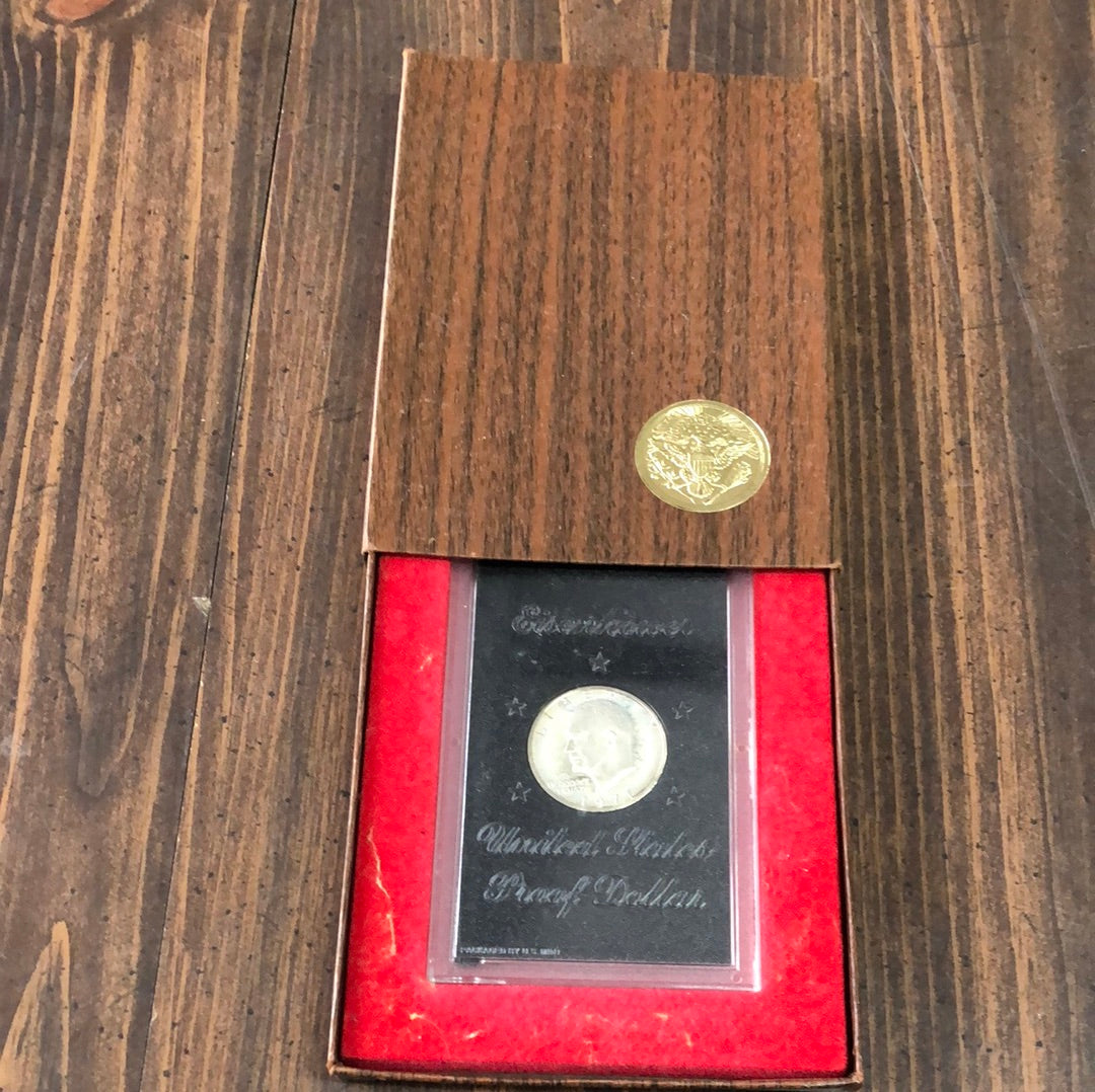 A specially minted 1971 Eisenhower 40% silver dollar pressed at the San Francisco mint. Sealed in a plastic container and in original wood textured box with the Great Seal in gold on the front.