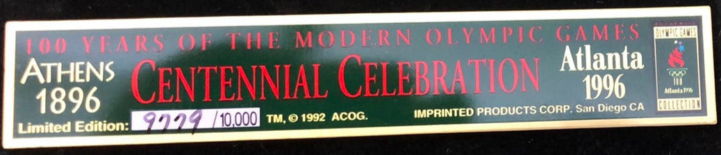 This beautiful set of four commemorative pins celebrates the '96 Atlanta Olympics and the 100th year of the modern Olympic games. This pin set is 9779/10,000 in a limited run and includes a certificate of authenticity from the minter.