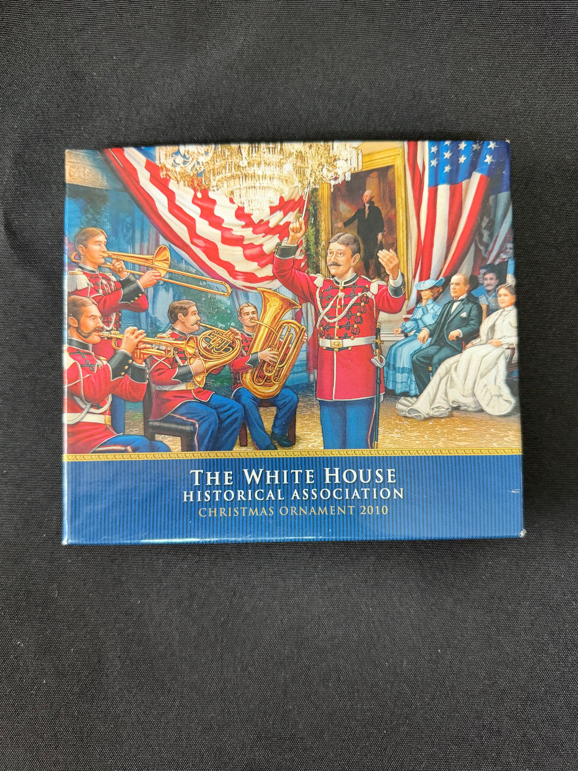 Official 2010 White House ornament crafted by the White House Historical Association, featuring elegant design and historical significance. A beautifully detailed collectible, perfect for holiday décor or adding to a presidential ornament collection.