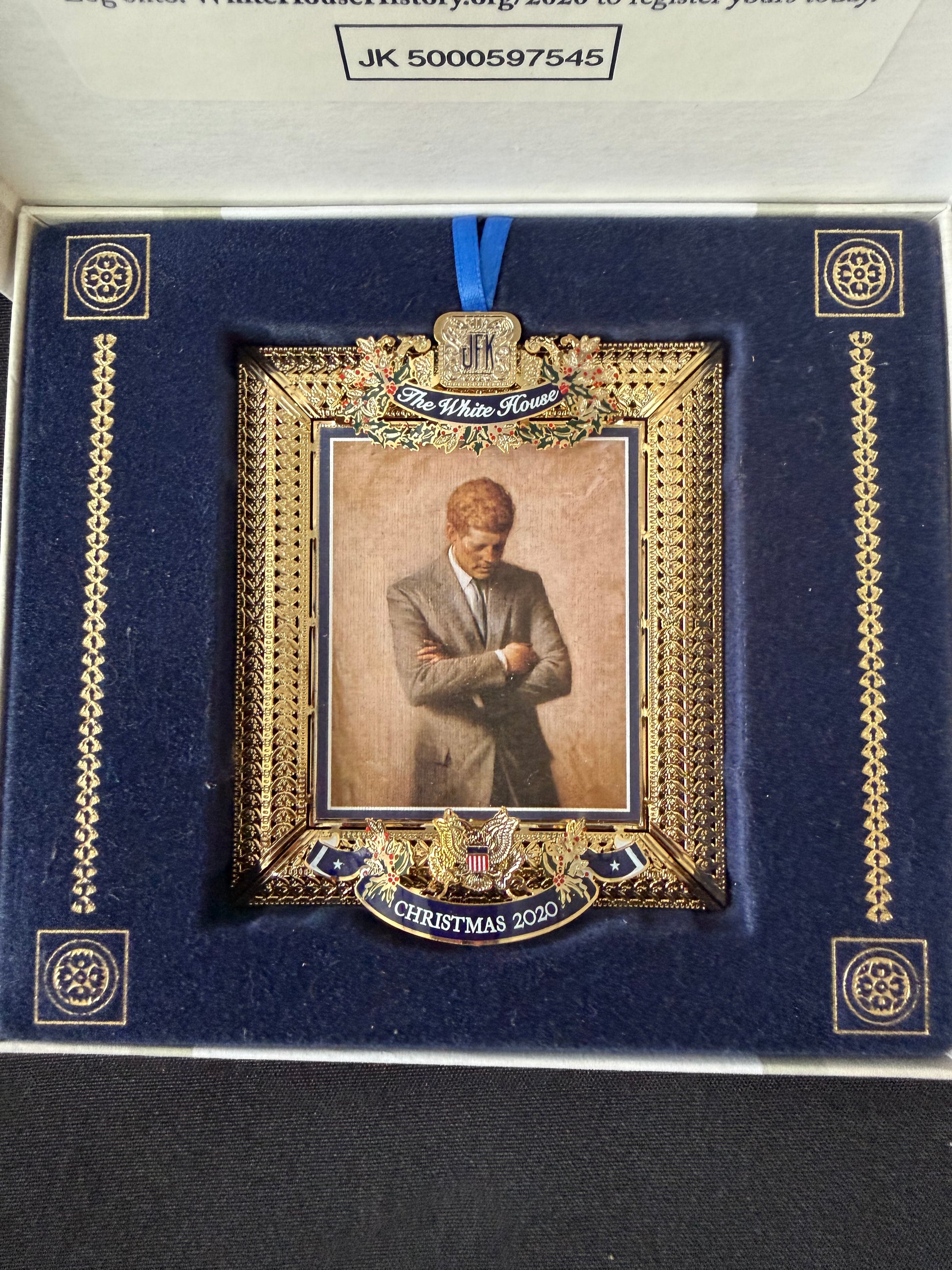 Official 2020 White House ornament crafted by the White House Historical Association, featuring exquisite detailing and patriotic design. A meaningful collectible celebrating American history, perfect for holiday décor or presidential ornament collections.