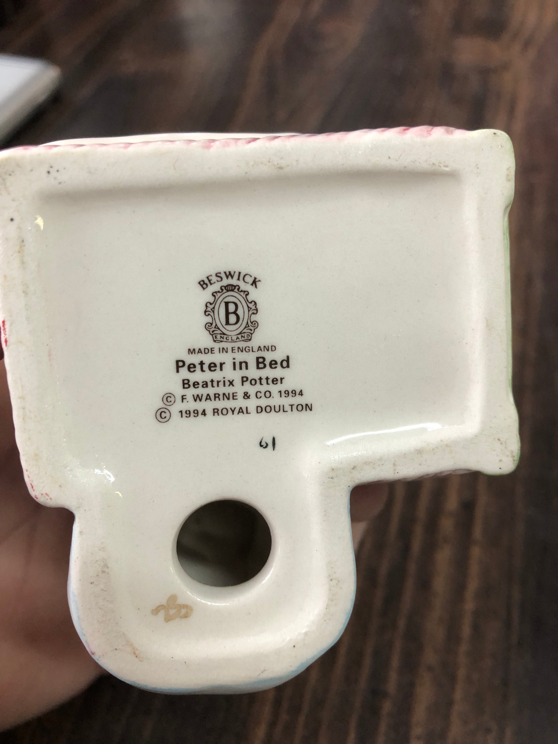 A Beswick Royal Doulton figurine from their "Beatrix Potter" collection depicting Peter Rabbit hiding in bed.