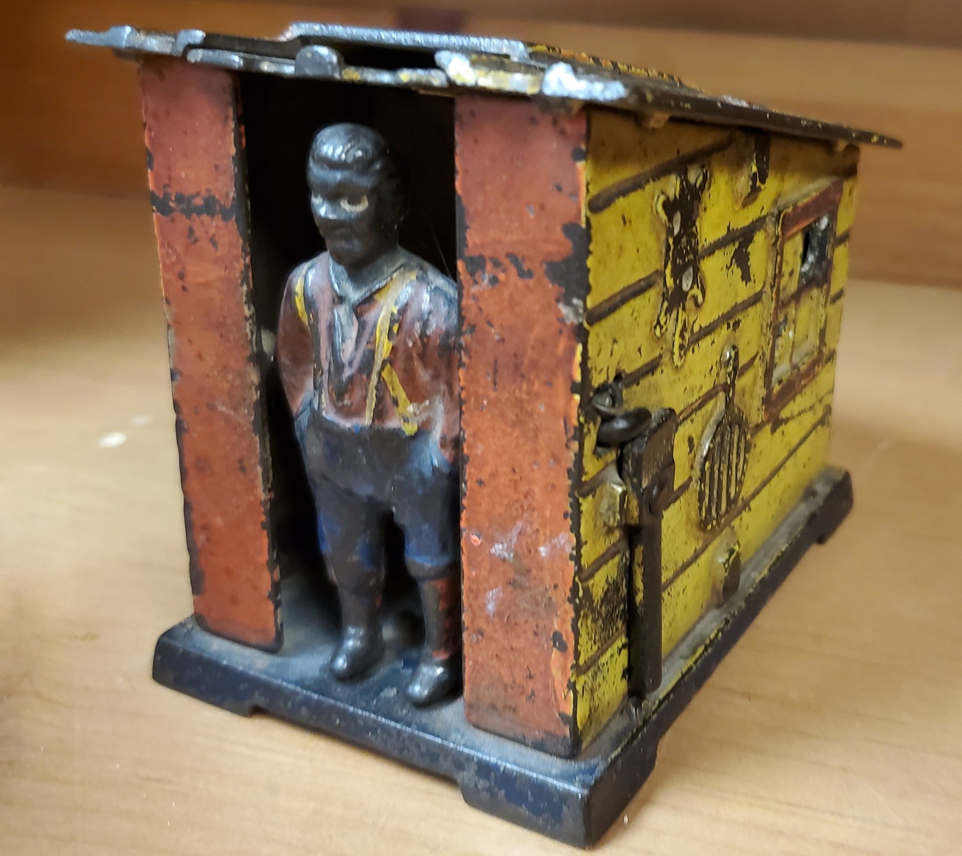 Painted Cast Iron Mechanical "Cabin" Bank, J. & E. Stevens, c. 1885, the yellow- and red-painted building with a figure standing in the doorway, a coin is laid on the edge of the roof and the brush on the side of the building is pulled to release the man to swing around and kick the coin into the bank, ht. 3 3/4 in.