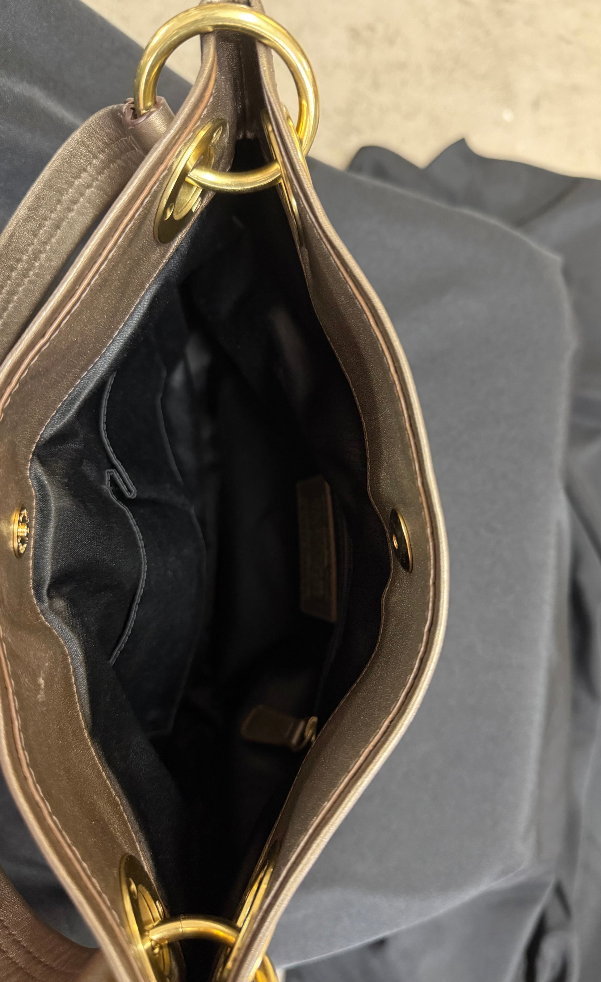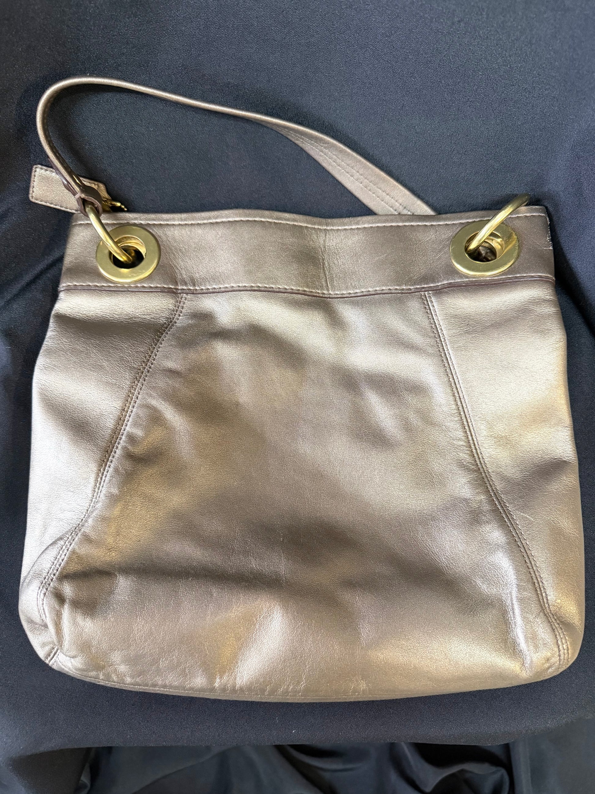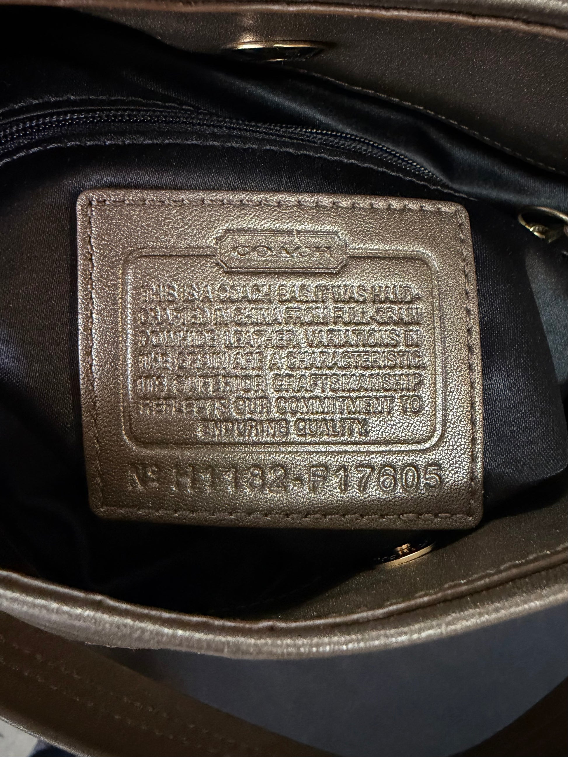 Sleek metallic shoulder bag with soft leather construction and classic Coach detailing. Features a roomy main compartment, interior pockets, and an option to add an adjustable strap for easy crossbody or shoulder wear. Lightweight, stylish, and perfect for everyday use.