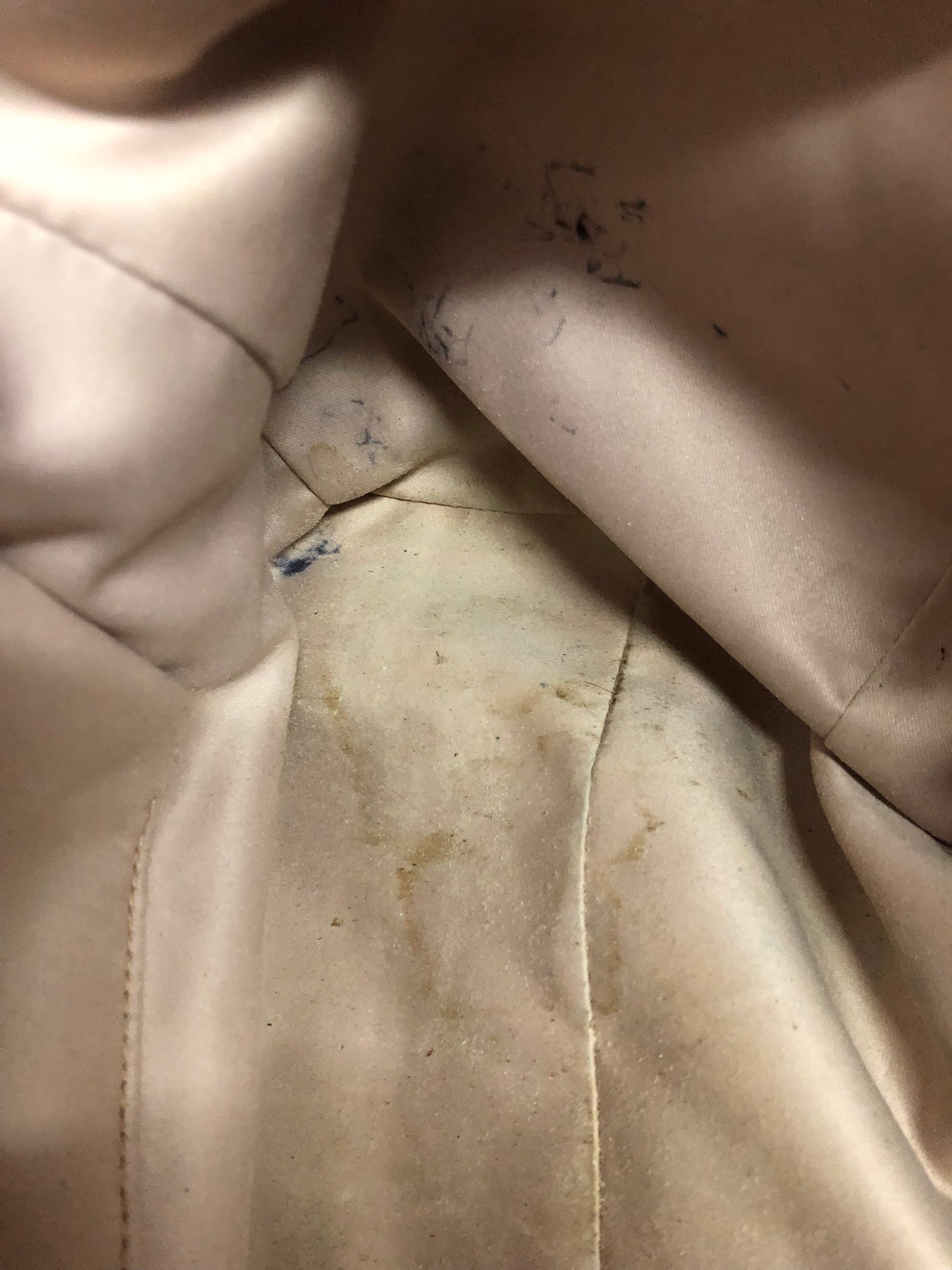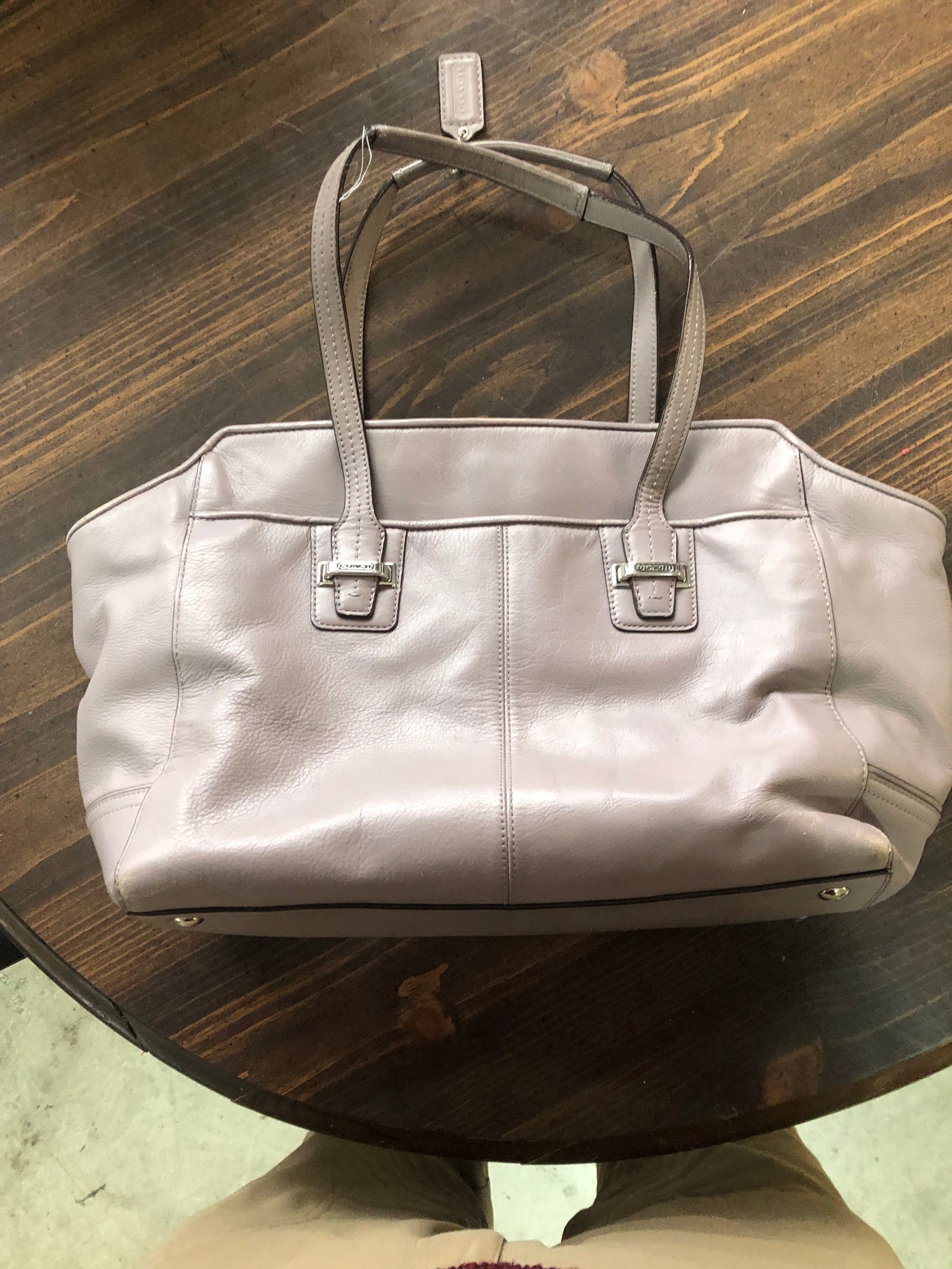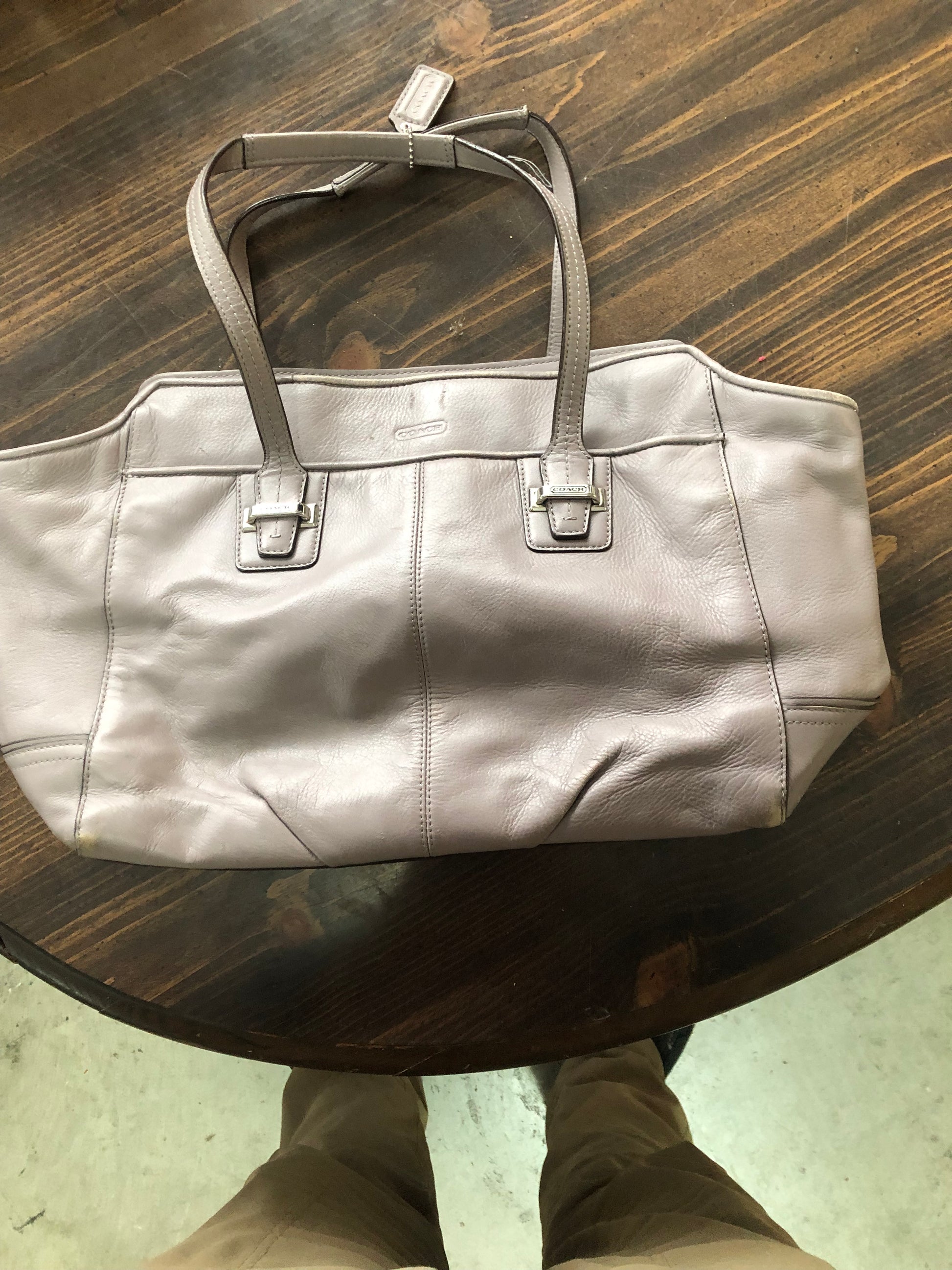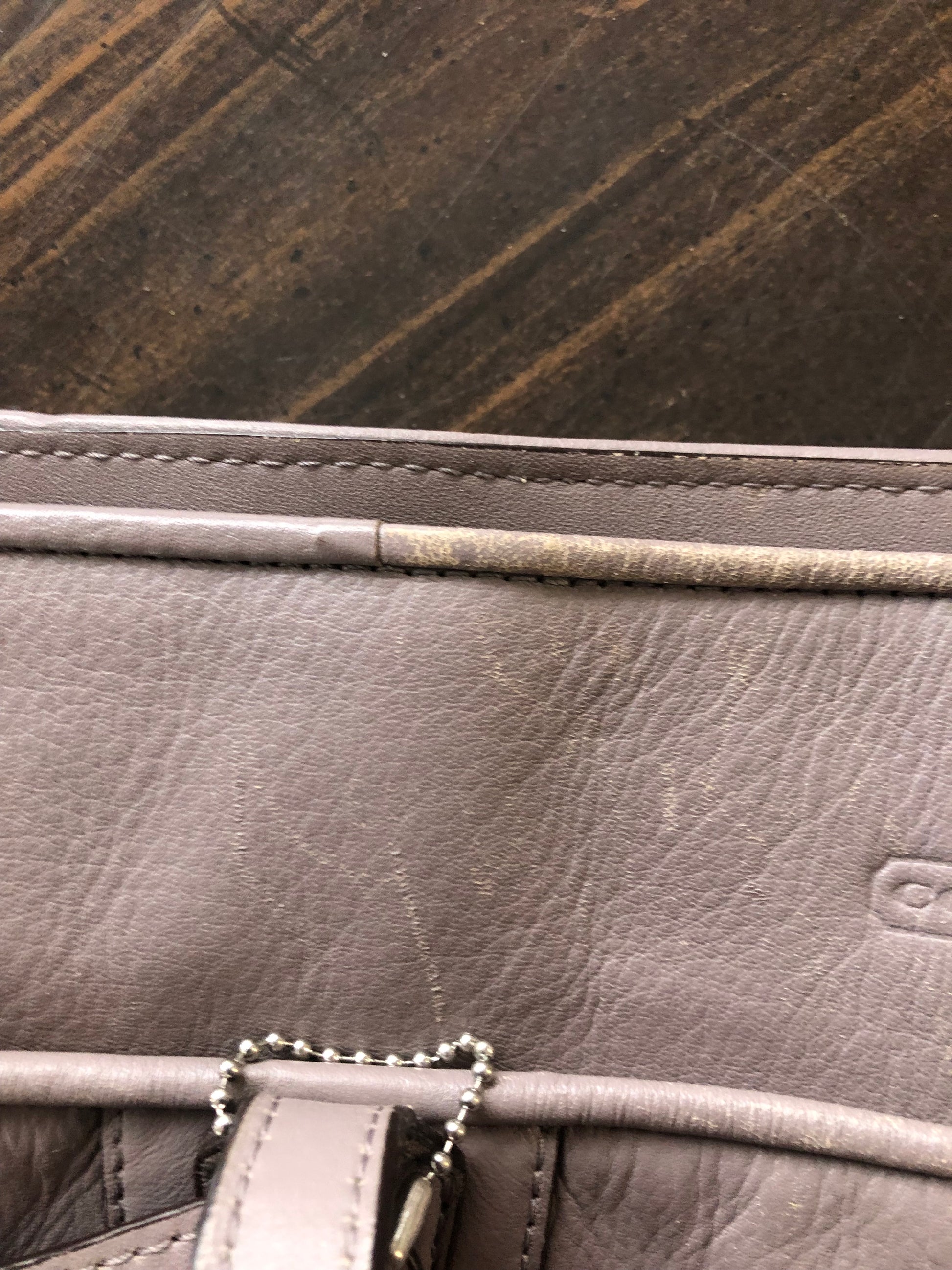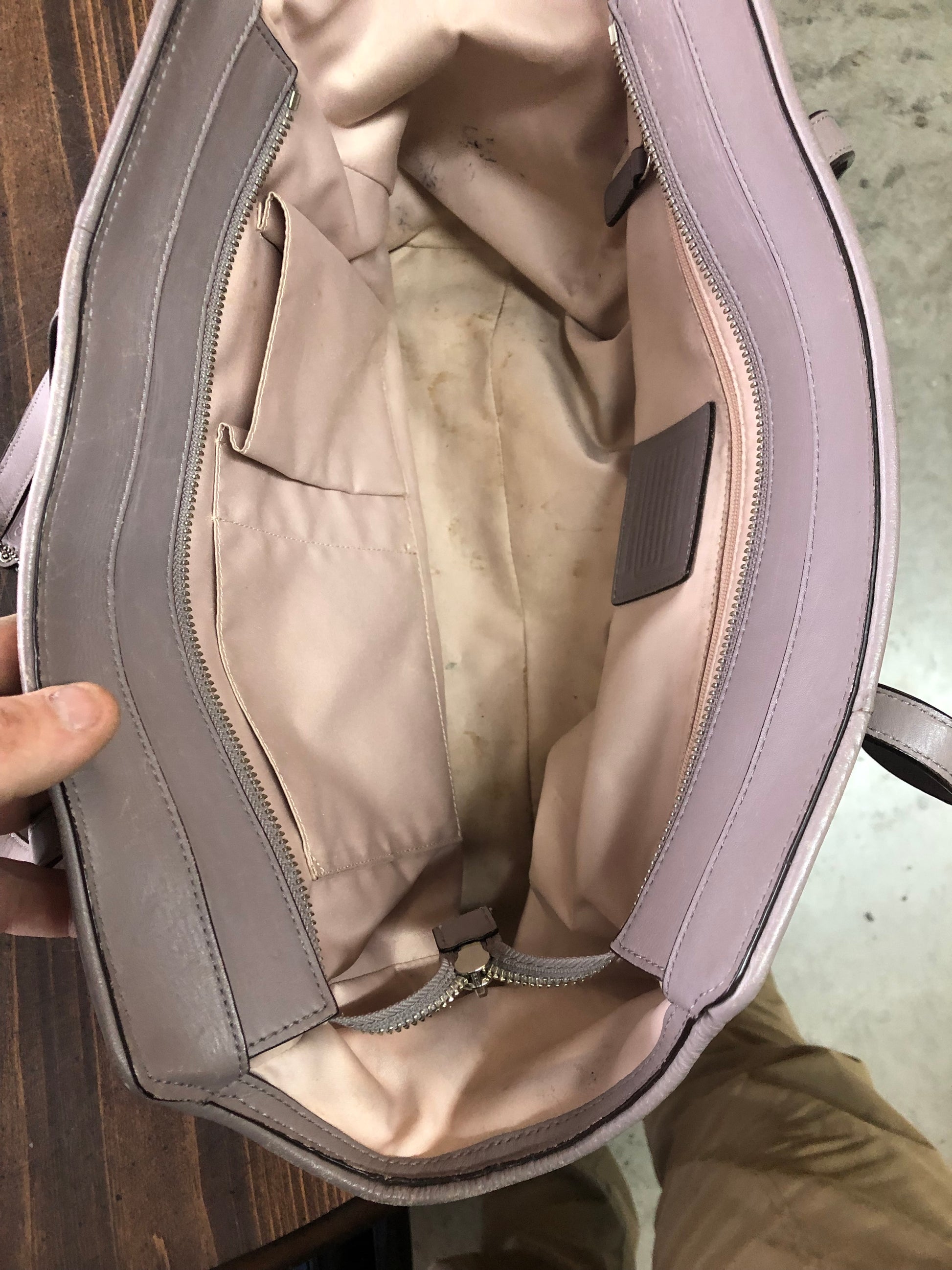 A beautiful Coach tote bag that has admittedly seen better days. The outside is still in very good condition with only a minor spot of discoloration on the leather. The inside lining is heavily stained in some places by what appears to be makeup.