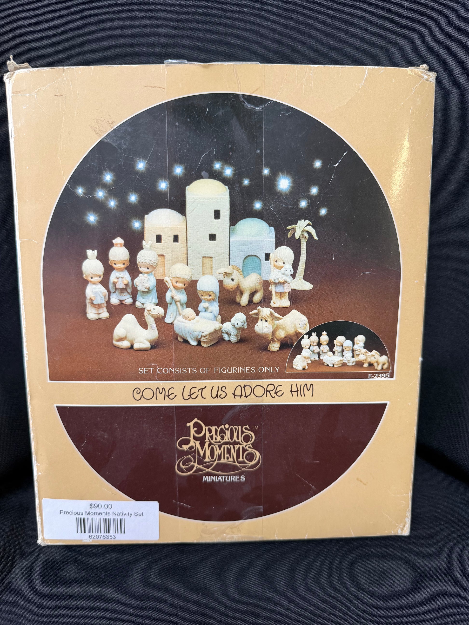 Heartwarming Precious Moments “Come Let Us Adore Him” figurine set featuring beautifully detailed characters from the Nativity scene. Perfect for holiday displays, collectors, or as a meaningful Christmas gift.