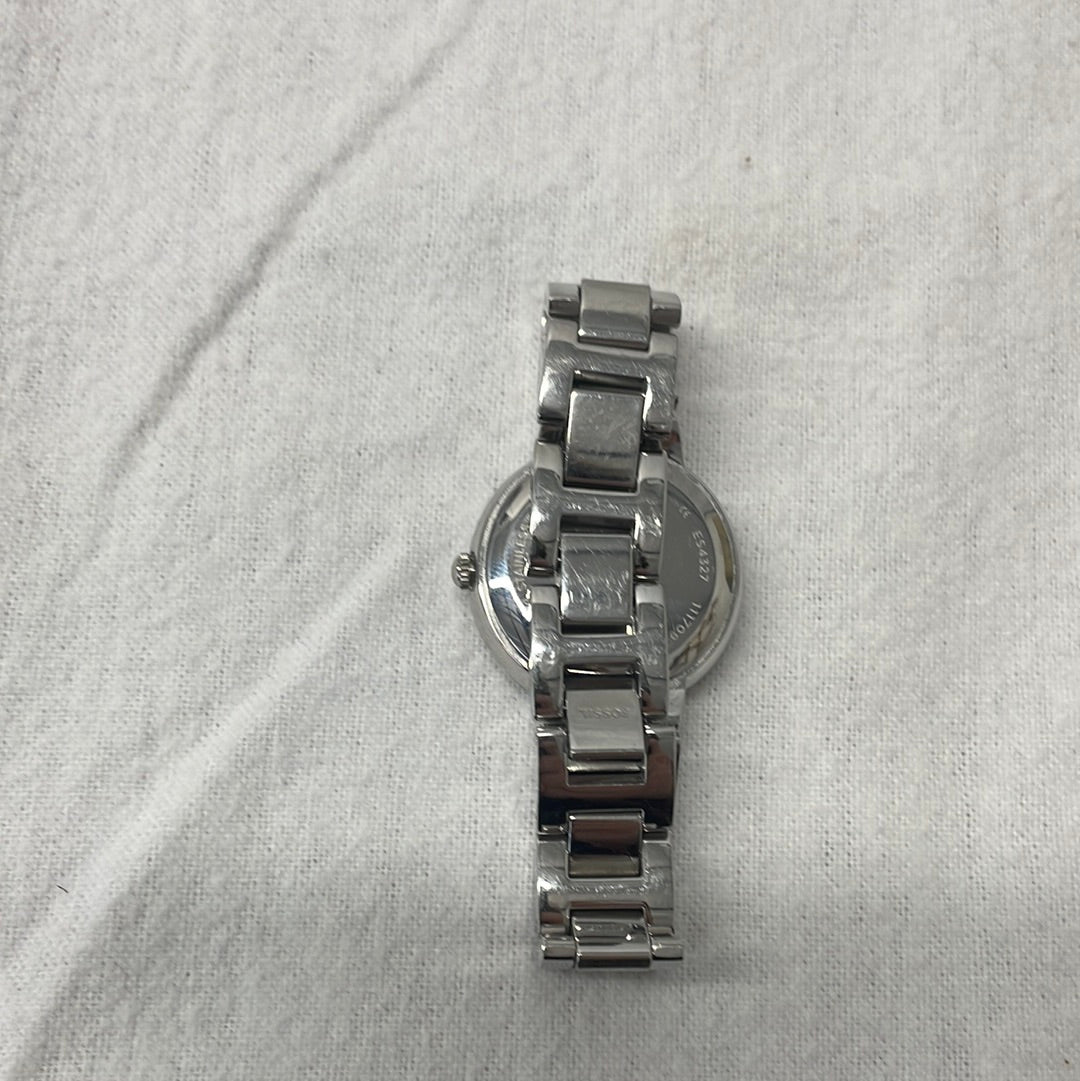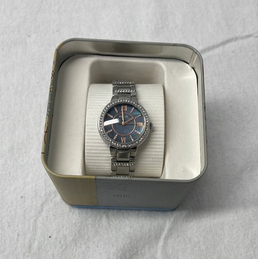 Women's Fossil Silver Timepiece (watch) with a Mother of Pearl Face and rose gold accenting on the face, a silver casing with white stones surrounding the face, white stone accents on the stainless steel strap. Quartz movement.