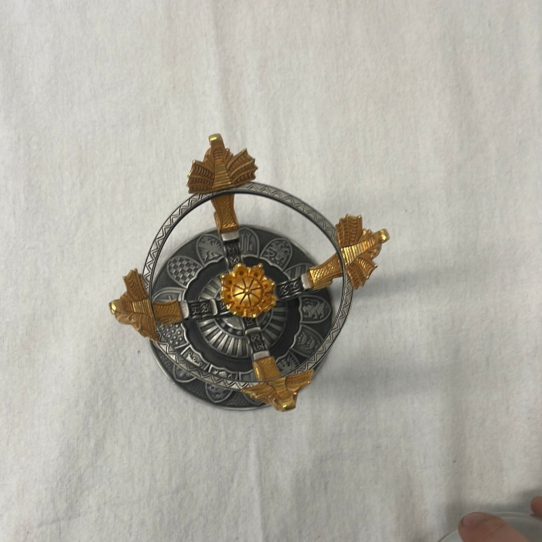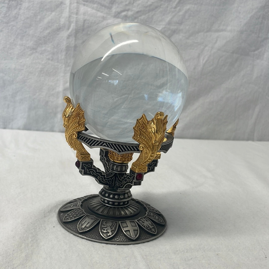 Rare Franklin Mint Merlin's Crystal Ball for the International Arthurian Society Dragons. Heavy metal stand, decorated with a gilded king's crown in the center, and four arms to hold the crystal ball, also golden appearing. The base has the 12 shields to represent the 12 knights of the round table. Excellent condition.