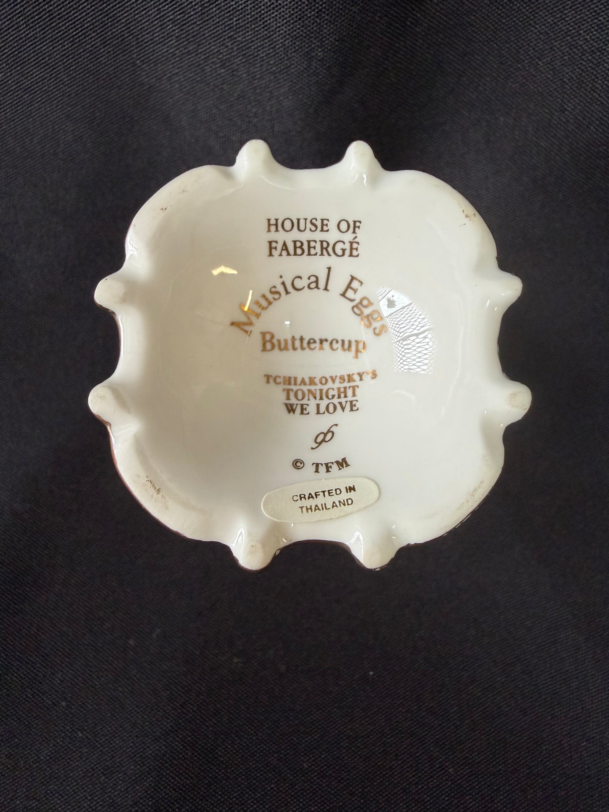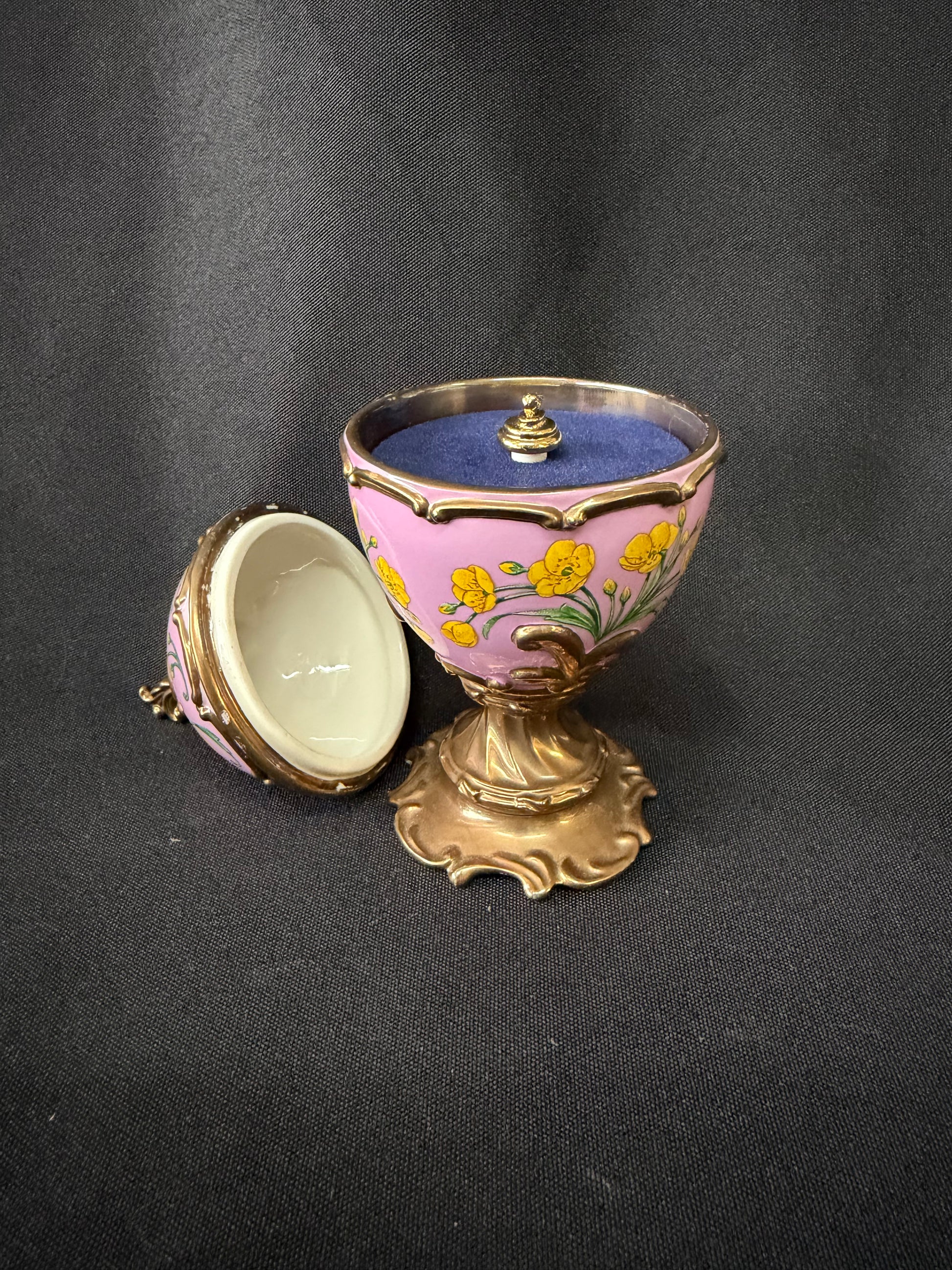 Elegant House of Fabergé “Buttercup” Musical Egg in soft pink enamel with gold-tone accents and floral design. Opens to reveal a delicate interior and plays a classical melody. A timeless collectible blending artistry and luxury — perfect for display or gift giving. Inside piece broken - still plays music.