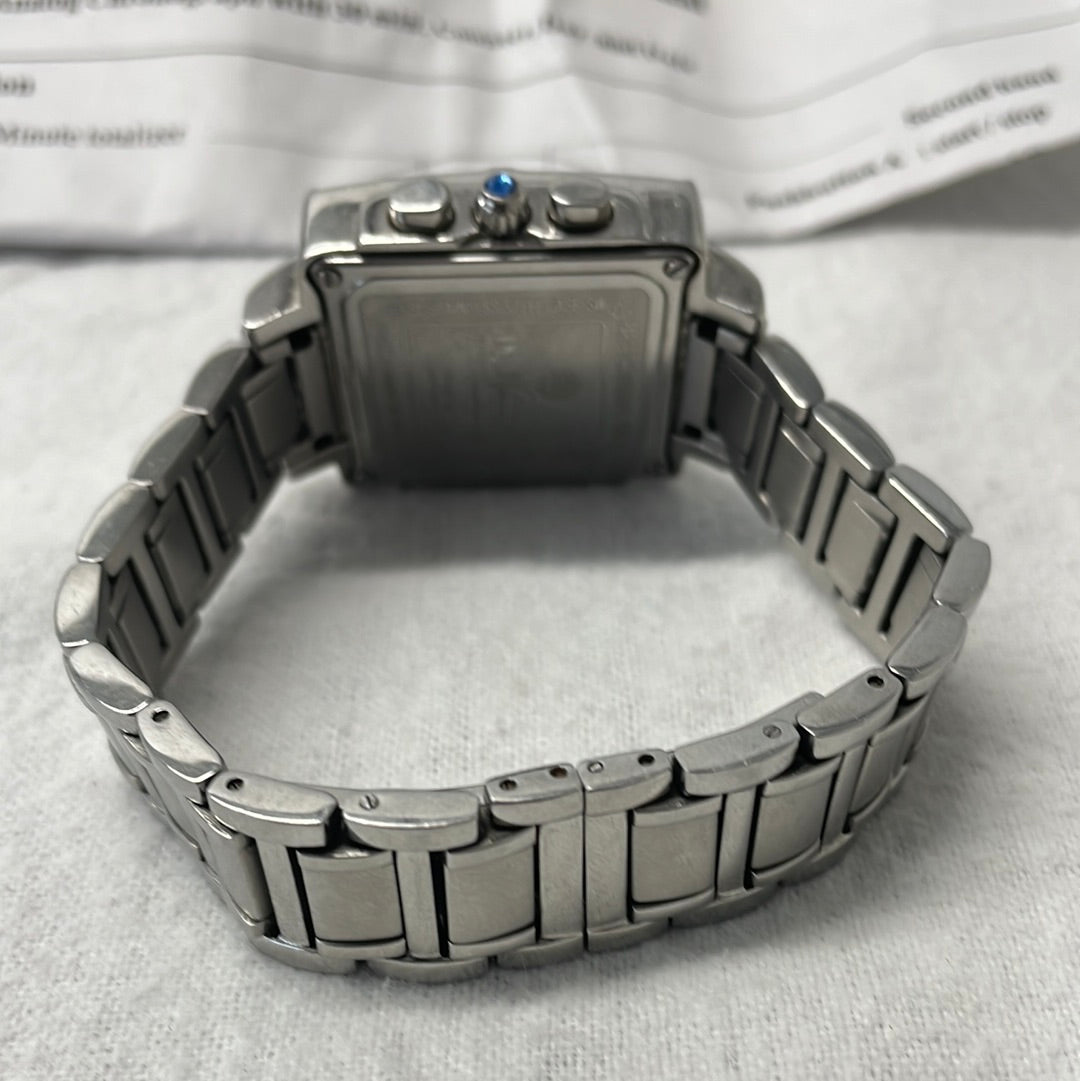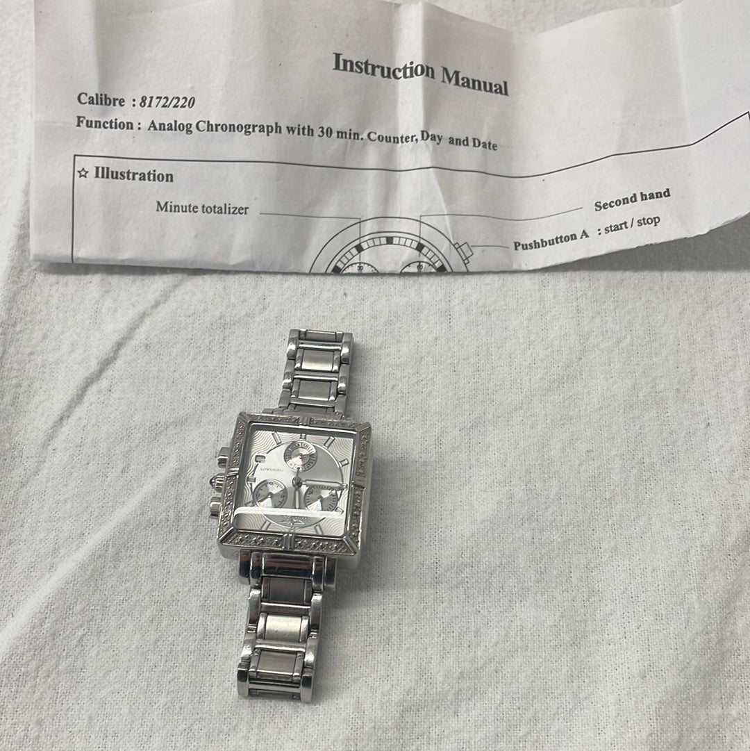 Square face, case material: stainless steel, in need of a new battery.