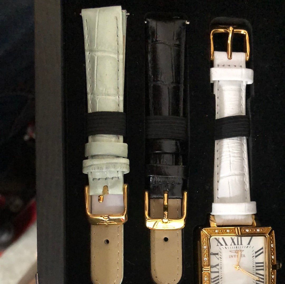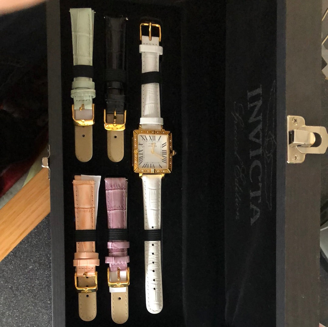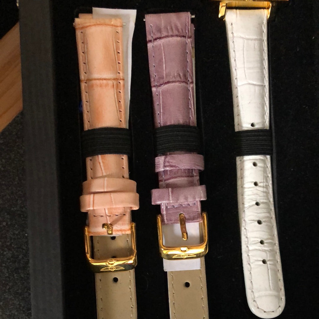 It is in mint condition, in box, with four additional leather bands. Features a 32.6mm stainless steel case inset with 16 white crystals and a Swiss quartz movement.