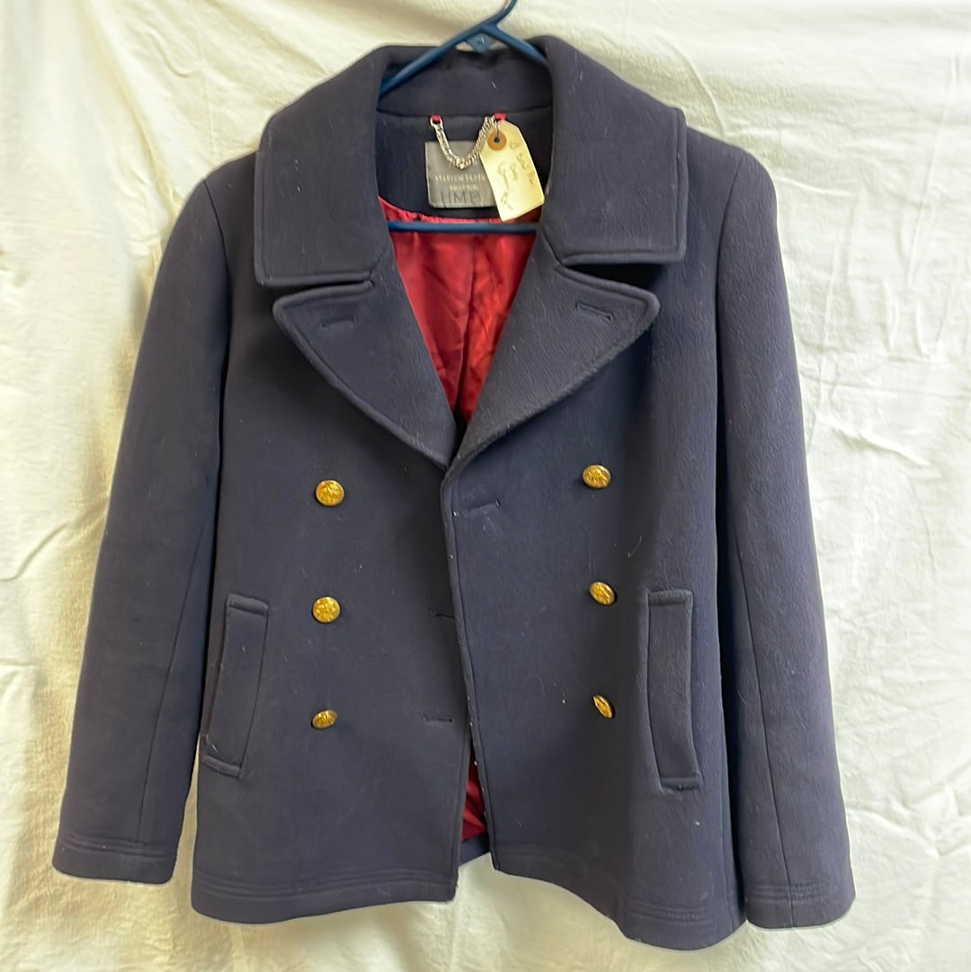 J Crew stadium cloth Nello Gobi pea jacket. Navy blue with gold buttons and red lining, size small