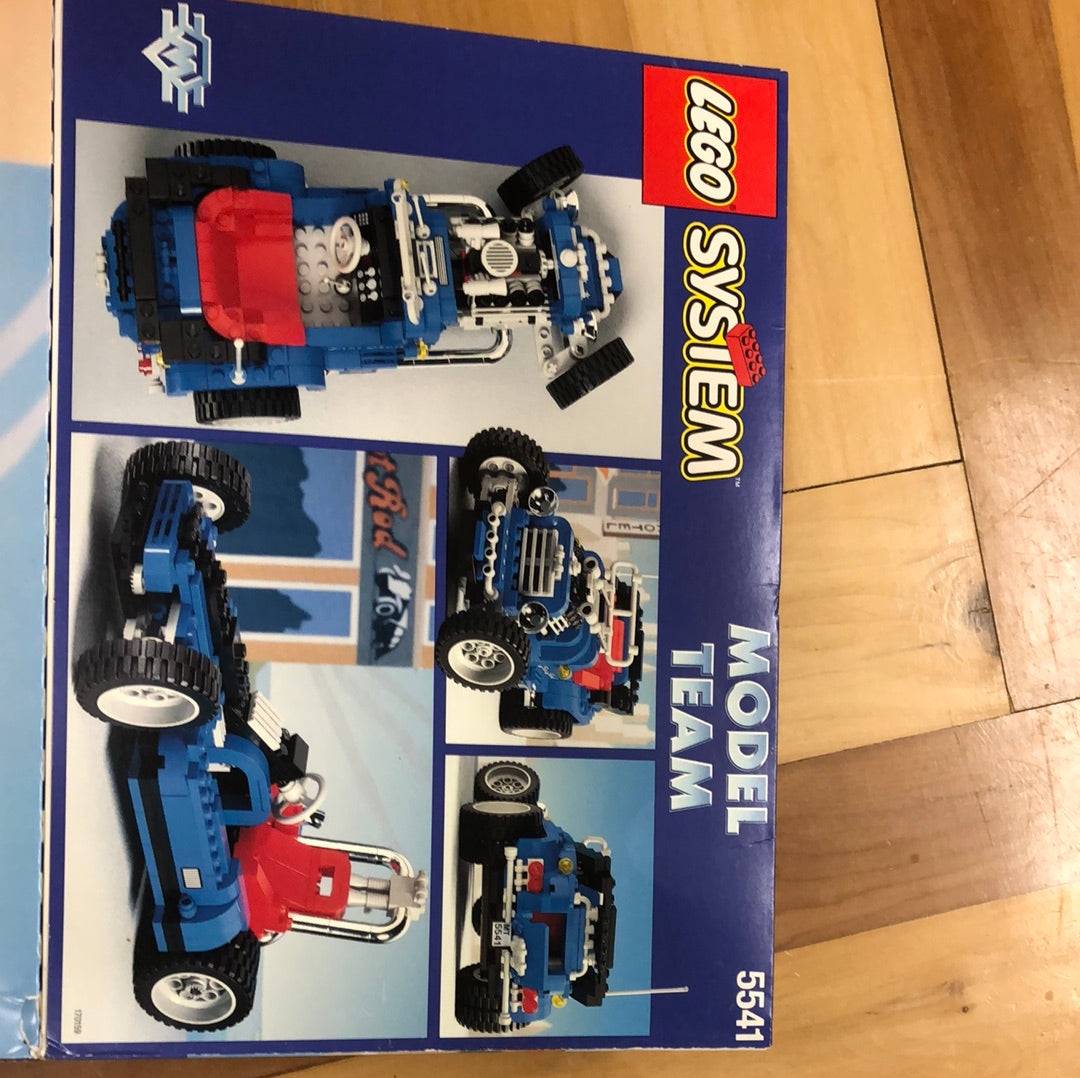 The 1994 LEGO Blue Fury Hot Rod. Includes original instruction booklet, unused original stickers, and all 419 pieces. LEGO pieces are like new; chrome is shiny and there is no evident yellowing. Box is worn and damaged