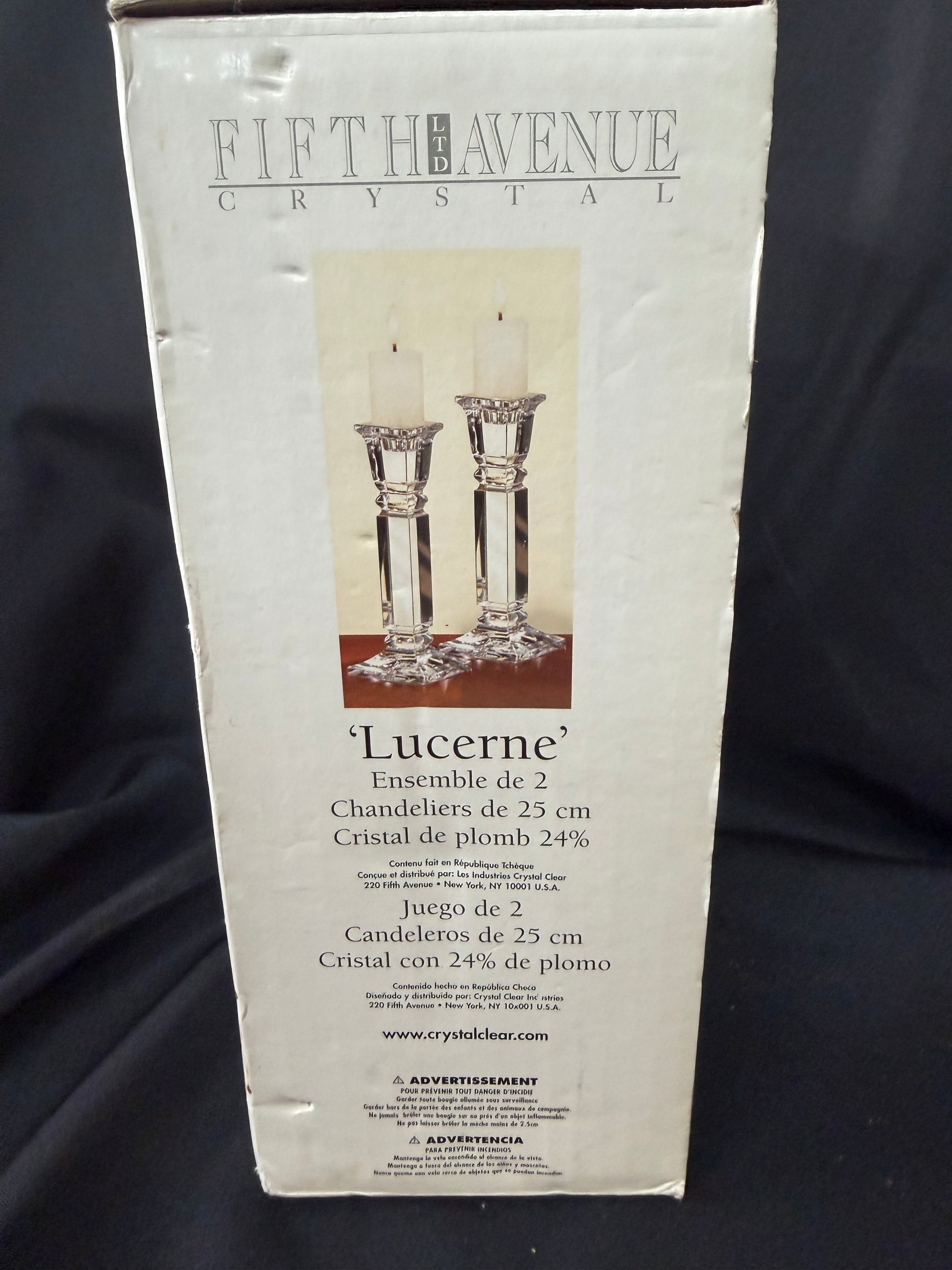Elegant pair of “Lucerne” candle holders crafted from 24% lead crystal, showcasing brilliant clarity and light-reflecting cuts. Produced by Crystal Clear Industries (Fifth Avenue Crystal), these timeless pieces add refined sparkle to dining tables, mantels, or formal décor. A sophisticated gift or collectible accent for crystal enthusiasts. Comes in original packaging.