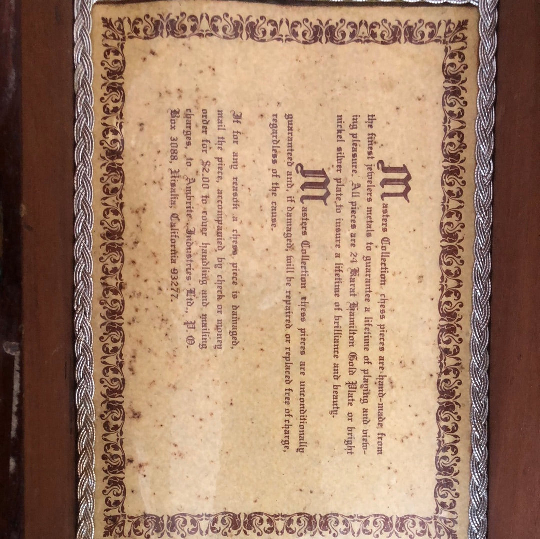 The Master's Collection chess set including 32 pieces resembling Napoleonic soldiers. Dated to the 1950's this chess set does not include a board but all pieces are either silver or gold plated nickel ensuring they will stand the test of time.