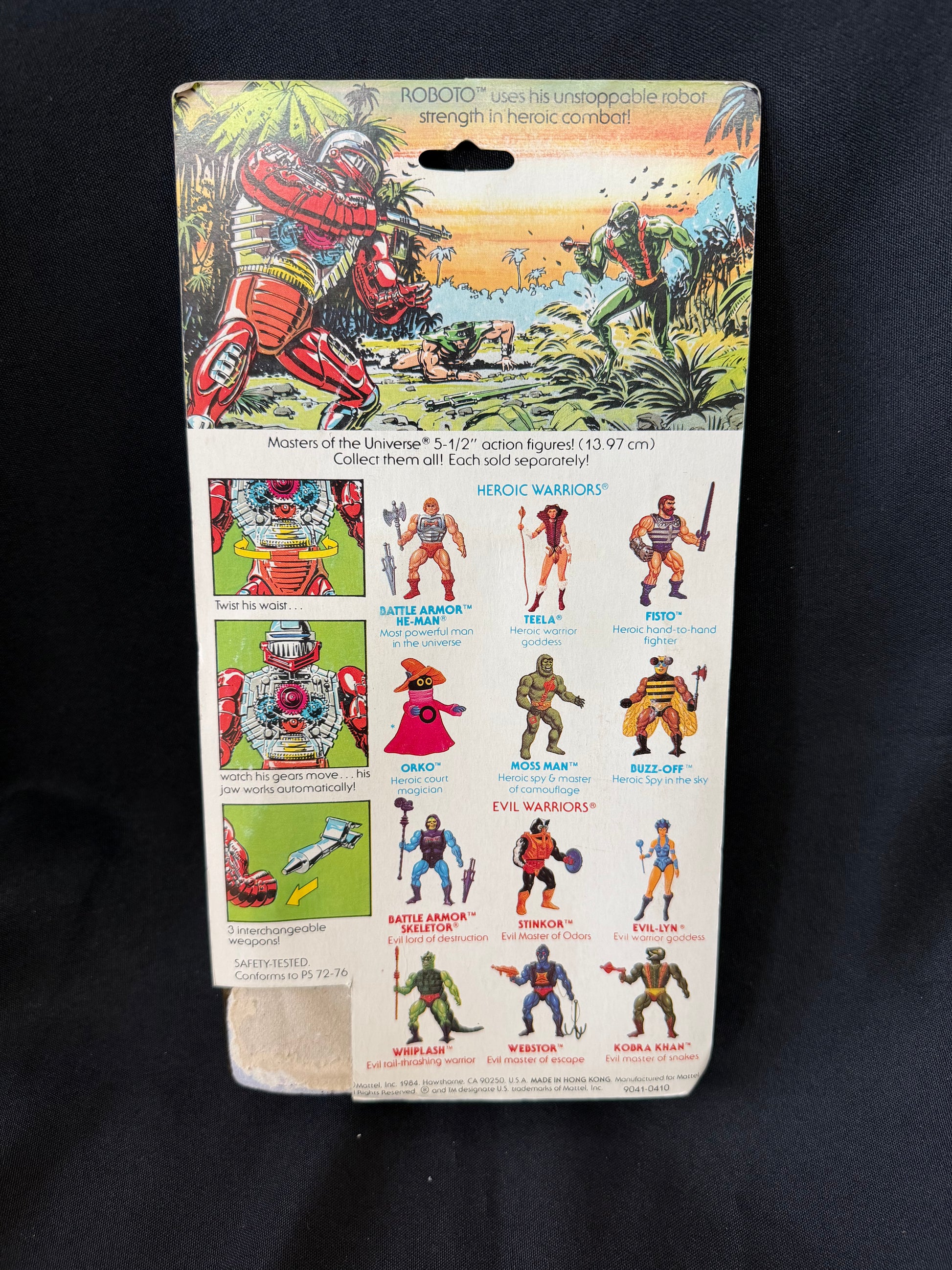 Classic MOTU Roboto action figure — a vintage mechanical hero character with a twisting waist and weapon accessories. Well-known for his robot‑themed design and compatibility with the 1980s Masters of the Universe lineup. A must-have for collectors aiming to complete their MOTU figure set or nostalgic fans reliving the golden age of ’80s action toys. Comes in factory sealed packaging.