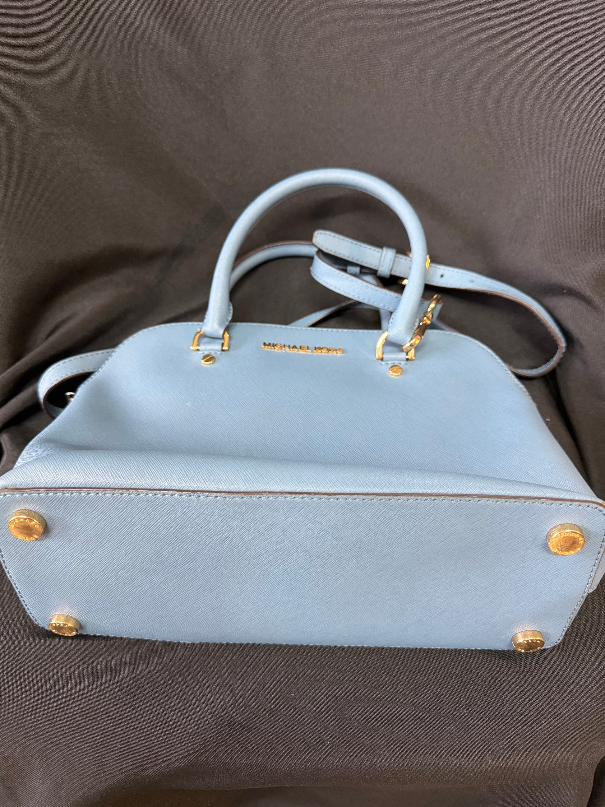 Elegant Michael Kors Cindy large dome satchel in soft pale blue leather, featuring gold-tone hardware, structured silhouette, and dual handles with a detachable shoulder strap. Spacious and stylish—perfect for everyday use, work, or adding a refined pop of color to your wardrobe.
