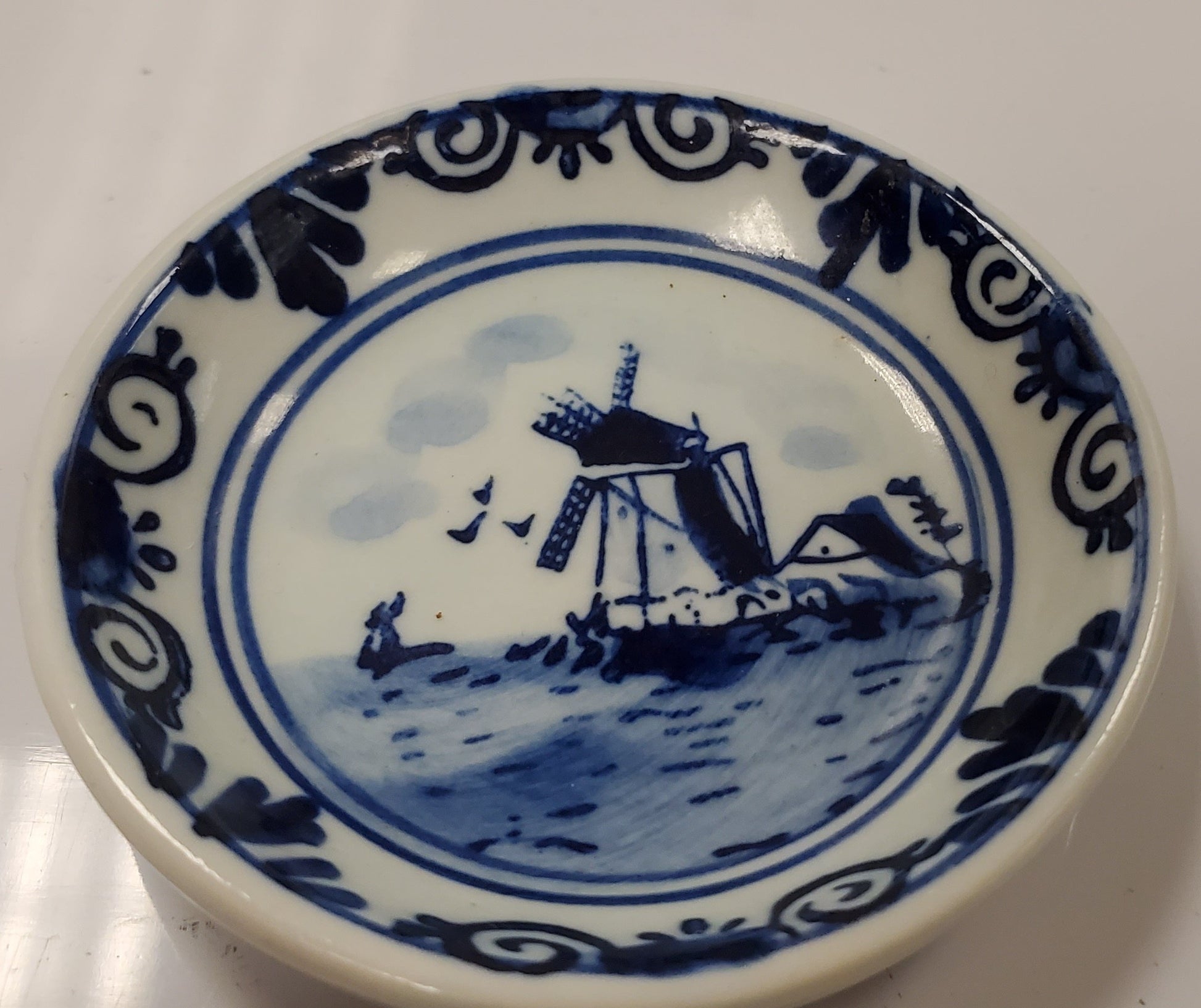 Vintage Miniature Plate. Holland Scene in Hand Painted Delft Blue. Windmill and House With Active Border Design.