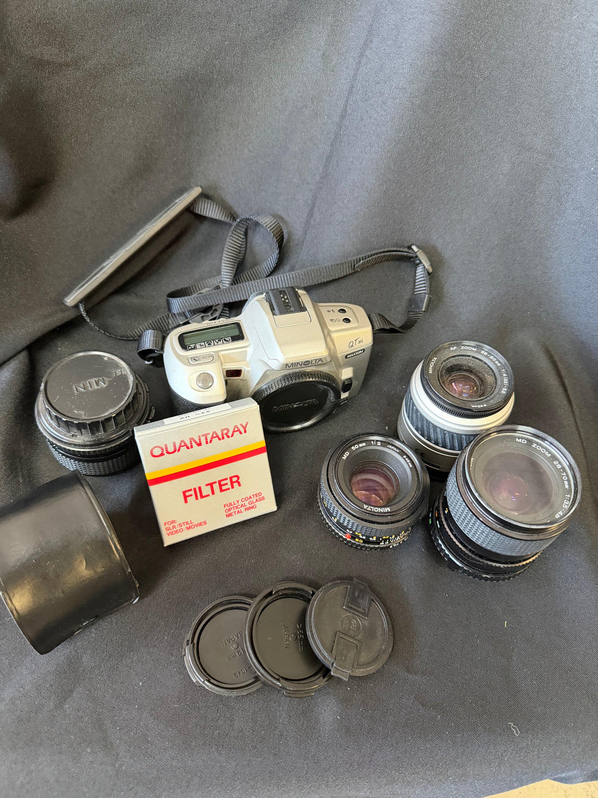 Complete Minolta Maxxum QTsi 35mm film SLR camera set including various attachments: 28mm lens, 28–70mm lens, and 35–80mm lens. Ideal for film photography enthusiasts seeking a versatile, all-in-one kit for wide-angle, standard, and telephoto shooting. Comes in full carrying case.