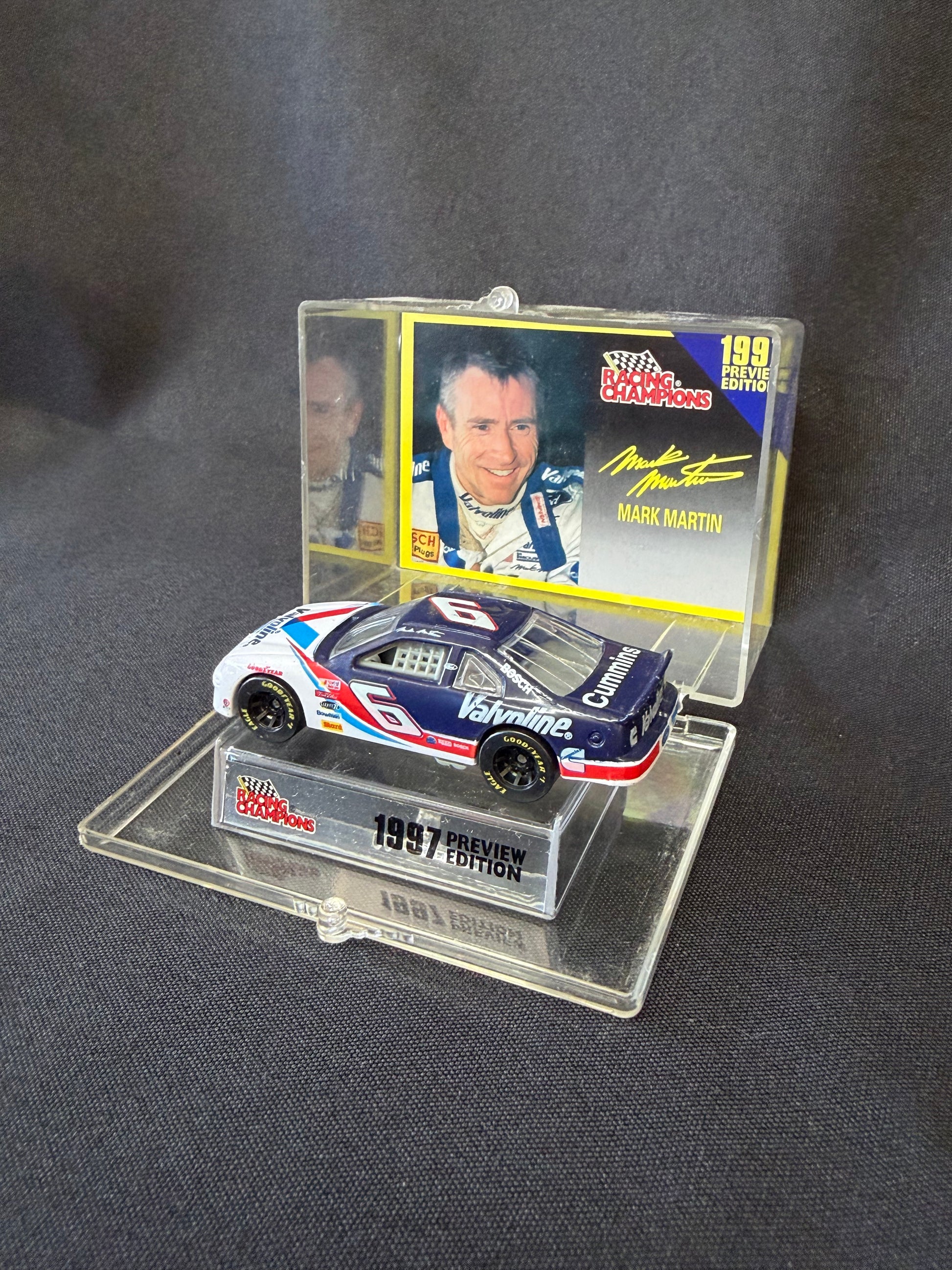 A special 1997 Preview Edition release, this Racing Champions die-cast showcases Mark Martin’s iconic #6 Valvoline Ford with authentic sponsor graphics and detailed race-day design. Crafted with precision die-cast metal and vibrant paintwork, it captures the look of one of NASCAR’s most consistent drivers at his peak. A standout piece for collectors and fans of 1990s NASCAR racing. Comes in original, plastic display case with signature on back.