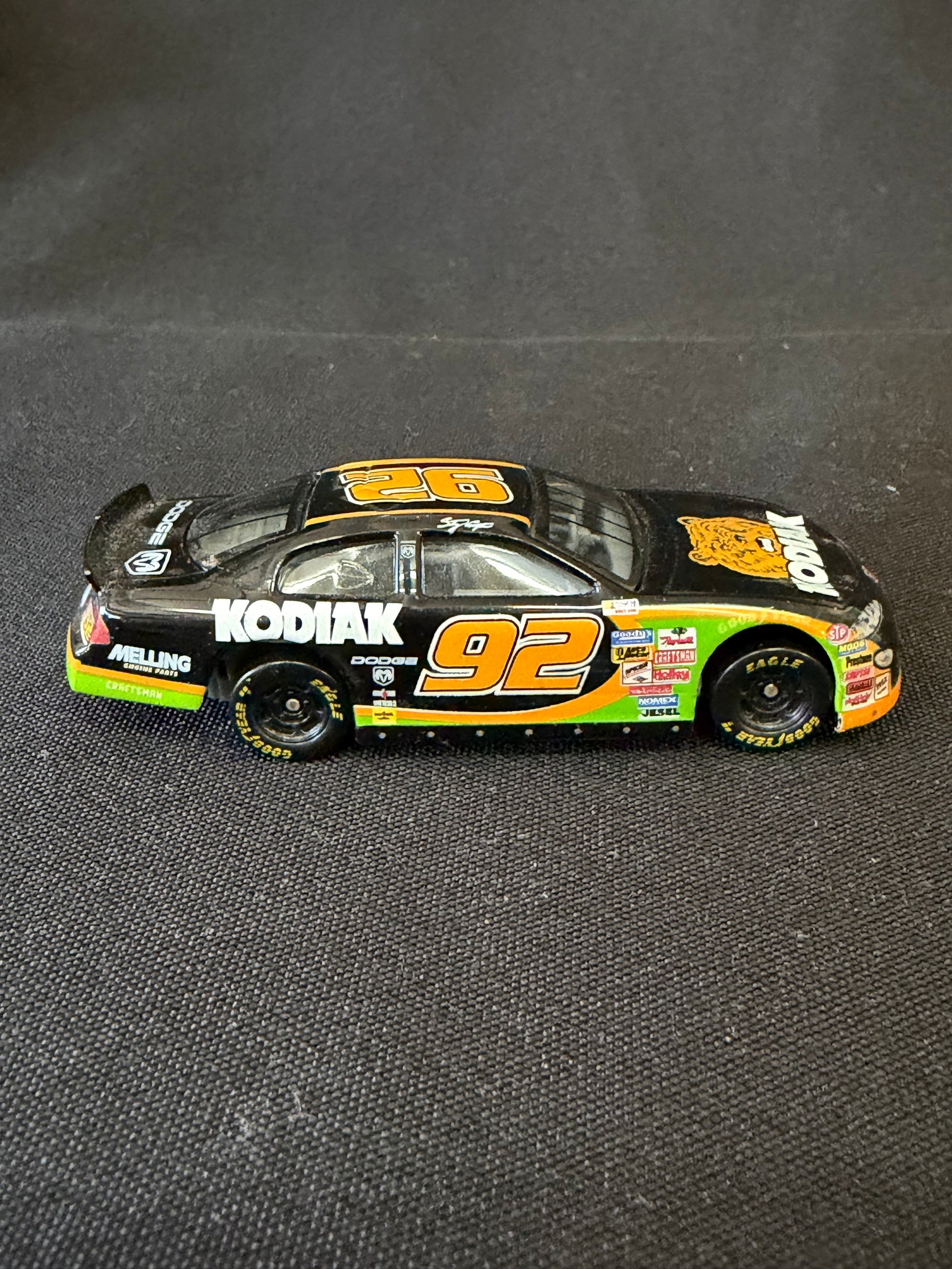 This Racing Champions die-cast showcases Stacy Compton’s #92 Kodiak Dodge Intrepid with bold sponsor graphics and authentic race-day detailing. Crafted from durable die-cast metal with precision paintwork, it captures the look and feel of 1990s NASCAR racing. A standout collectible for fans of Stacy Compton and vintage NASCAR die-casts. Car only - no display case.