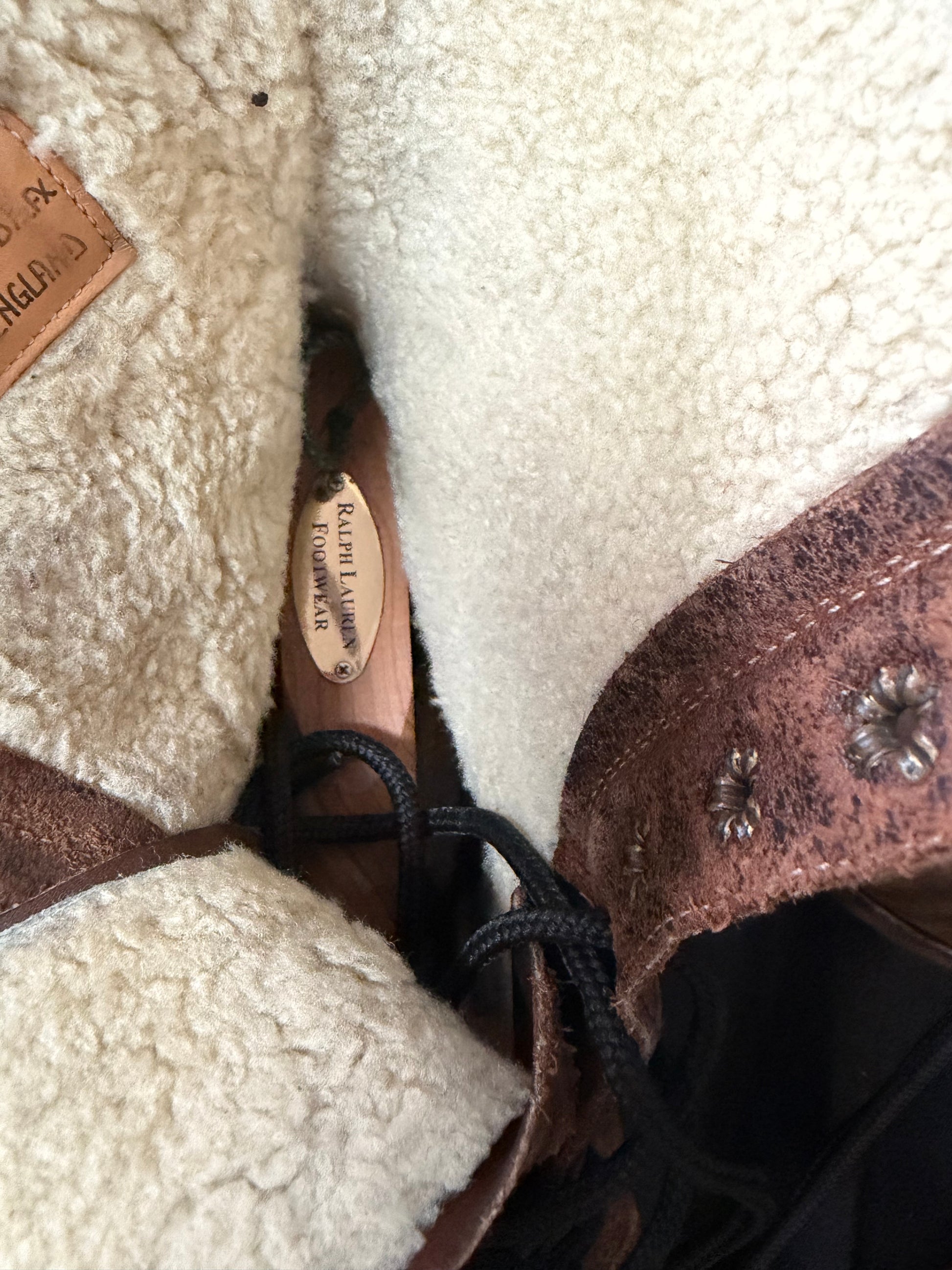 Durable Ralph Lauren lace-up leather work boots featuring sturdy construction, classic design, and premium leather. Ideal for outdoor wear, rugged work environments, or adding a timeless, versatile boot to your collection. Made in England.