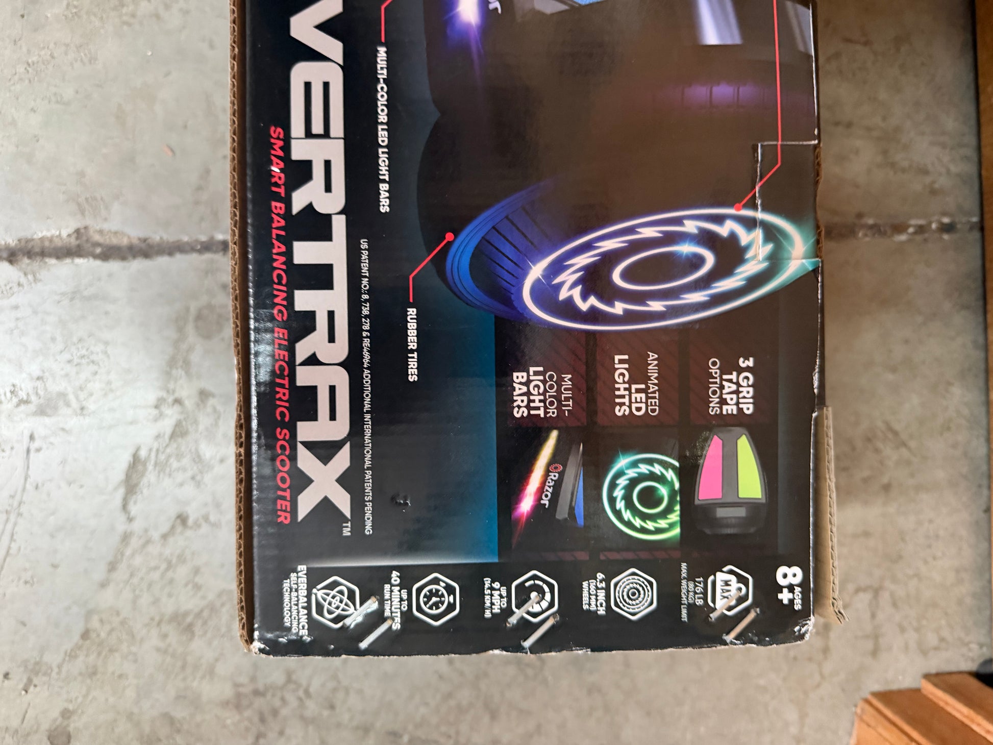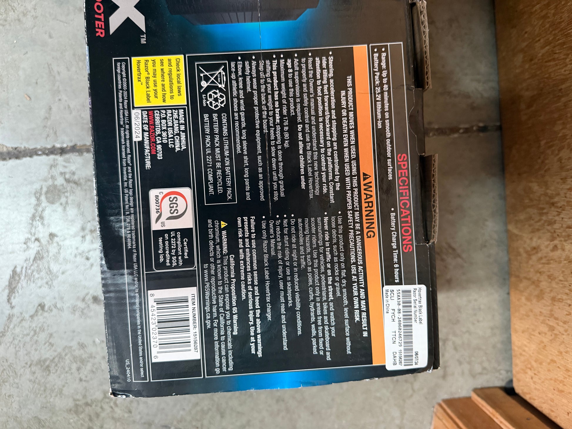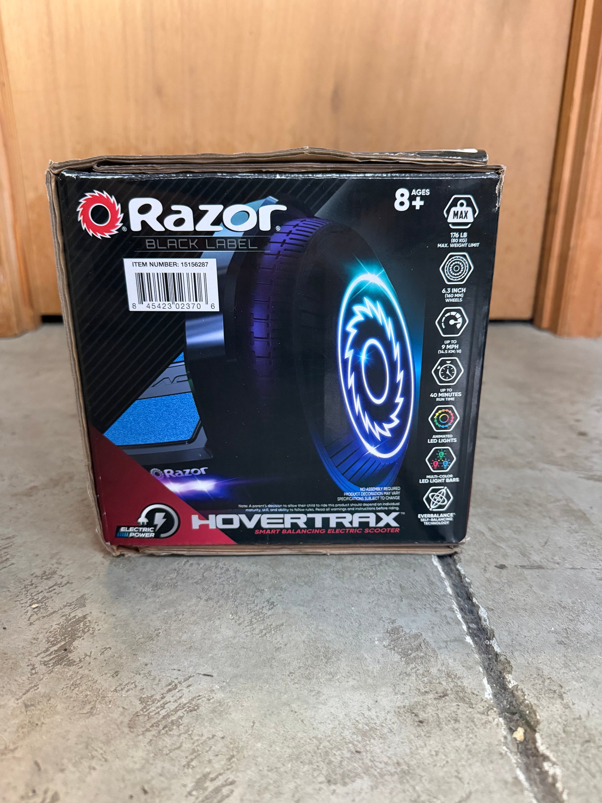 Sleek black Razor Hovertrax self-balancing electric scooter from the Black Label series, featuring eye-catching decals and smooth, responsive ride control. Designed with intuitive balance technology and a lightweight, durable build—perfect for cruising around neighborhoods or campuses. A fun, easy-to-use personal transporter for riders seeking stylish, battery-powered mobility. Comes in original packaging.