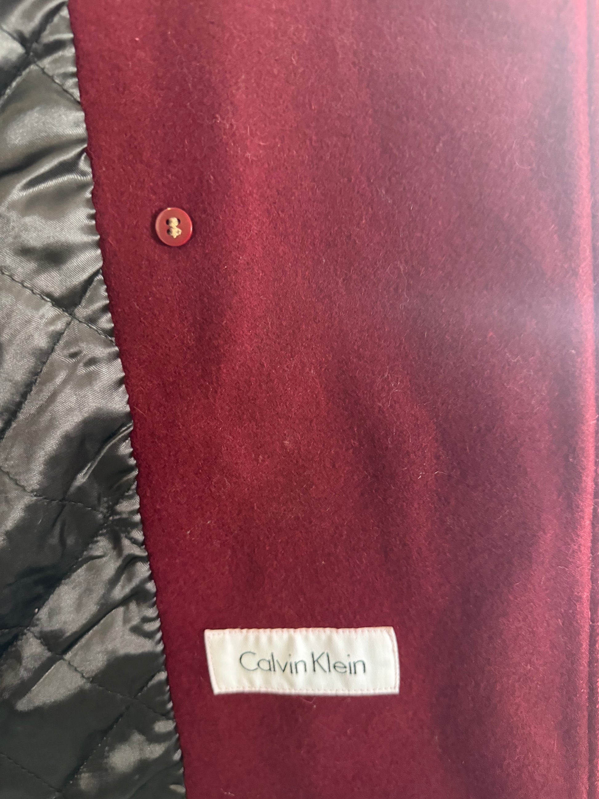 Luxurious Calvin Klein coat jacket in rich red wool, featuring a tailored silhouette and elegant design. Perfect for formal events, evening wear, or adding a bold statement piece to your wardrobe