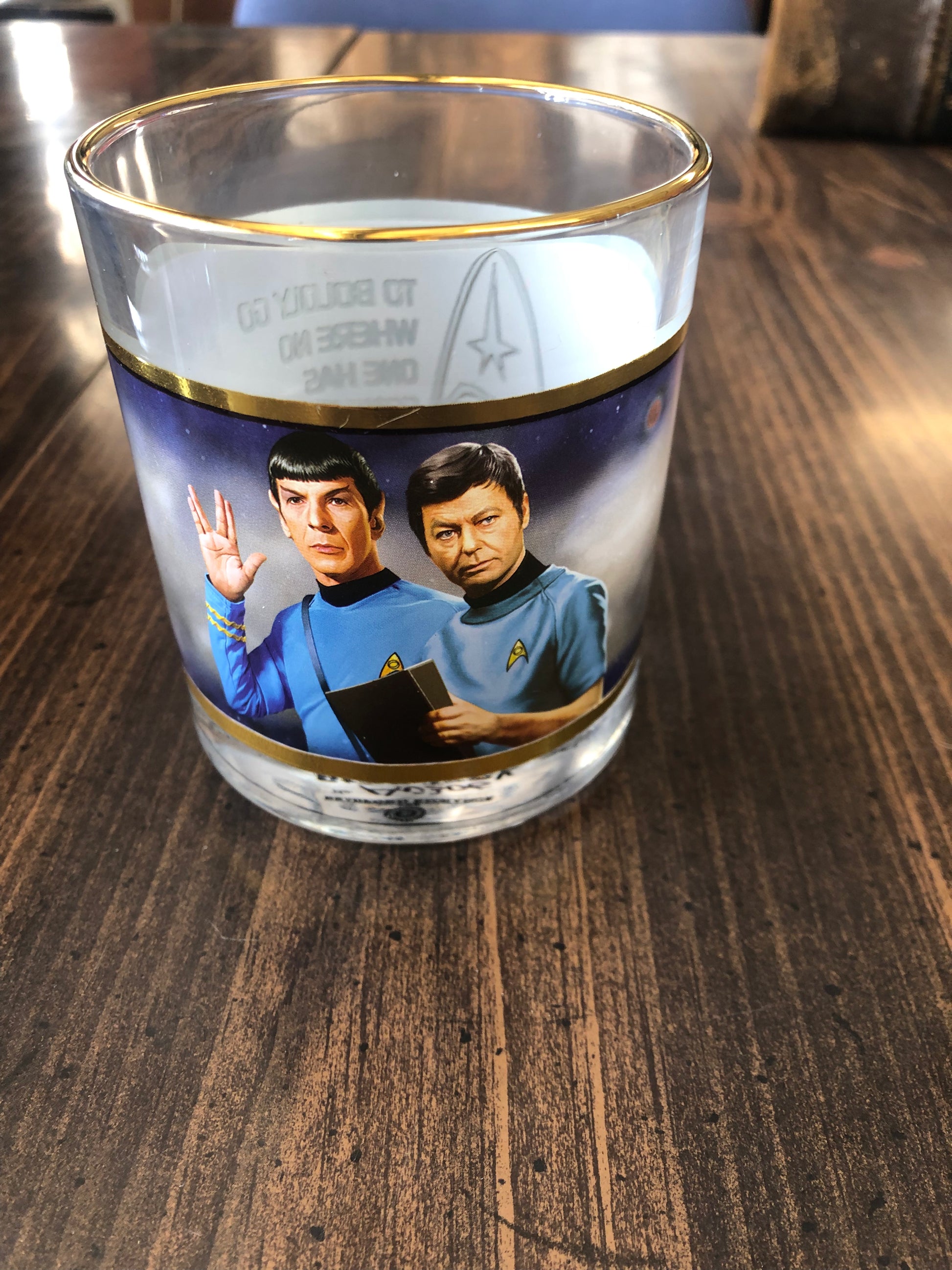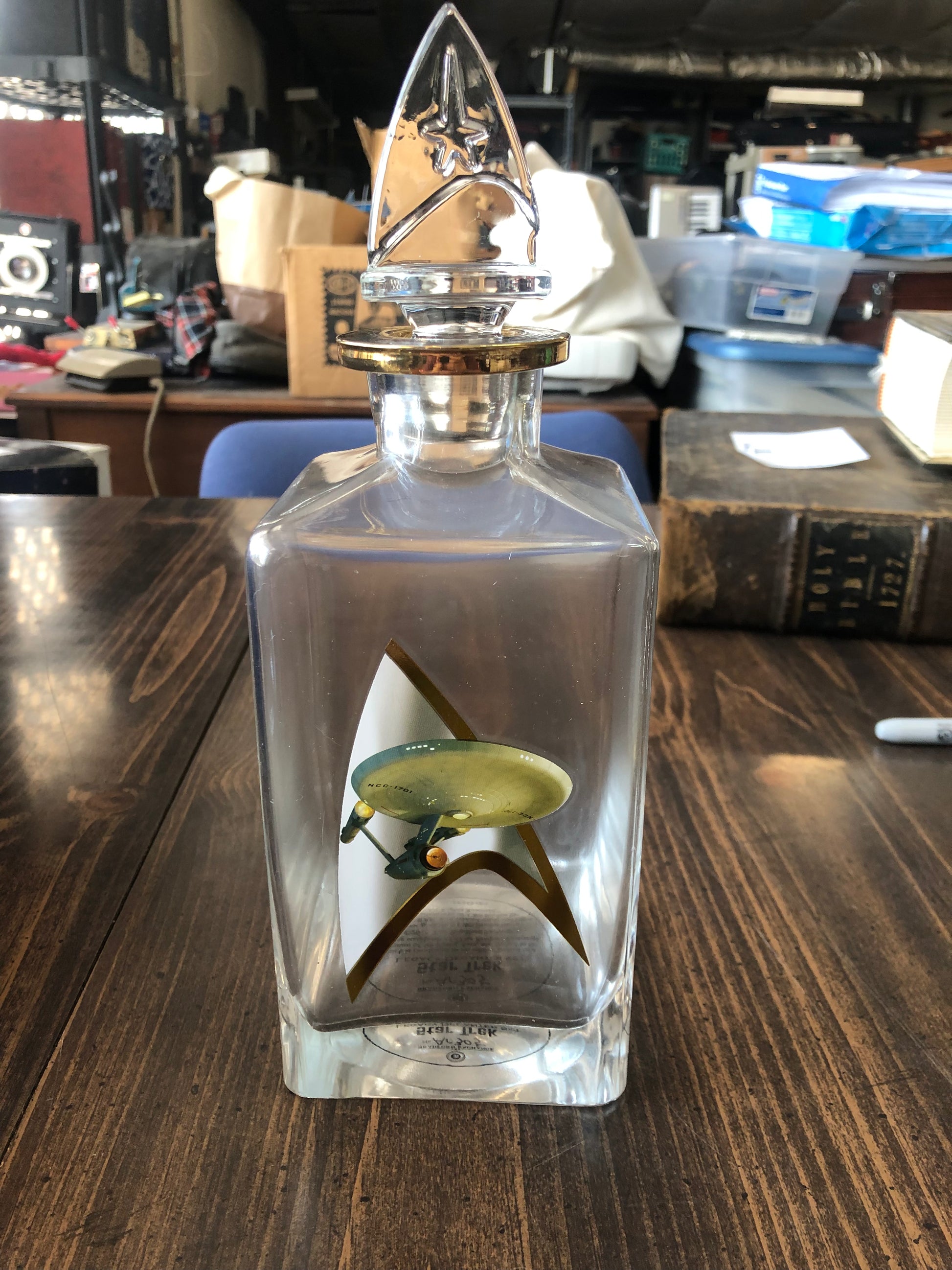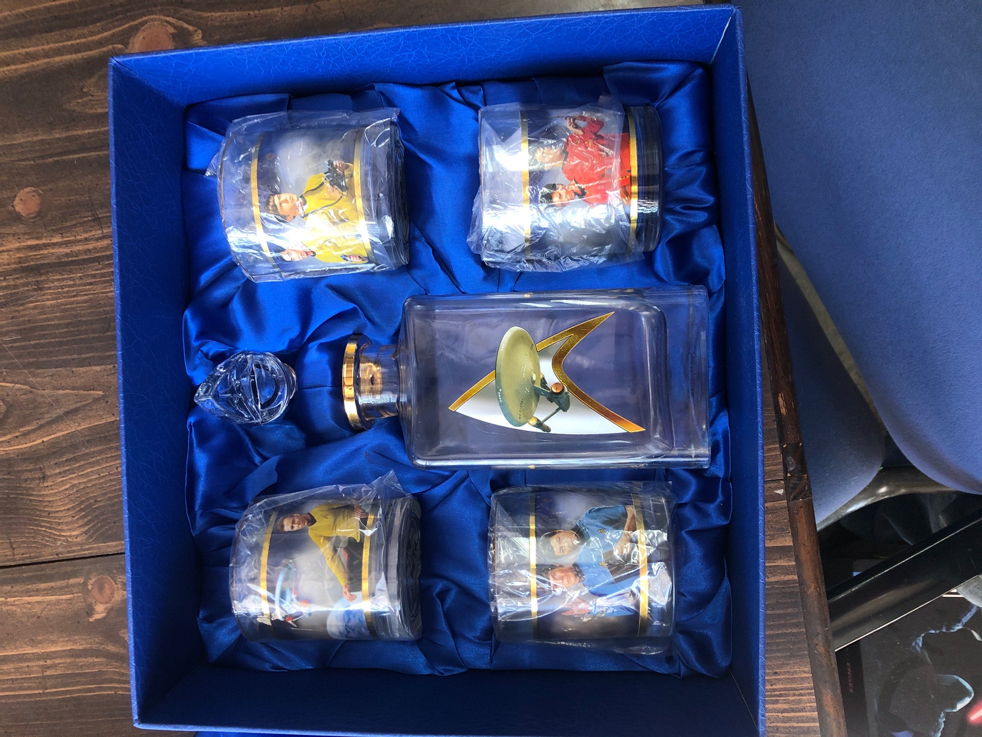 Including four 10oz. crystal glasses depicting the valiant crew of the Star Ship Enterprise and a 24oz decanter with an image of the ship herself and a stopper in the image of the classic Federation insignia.