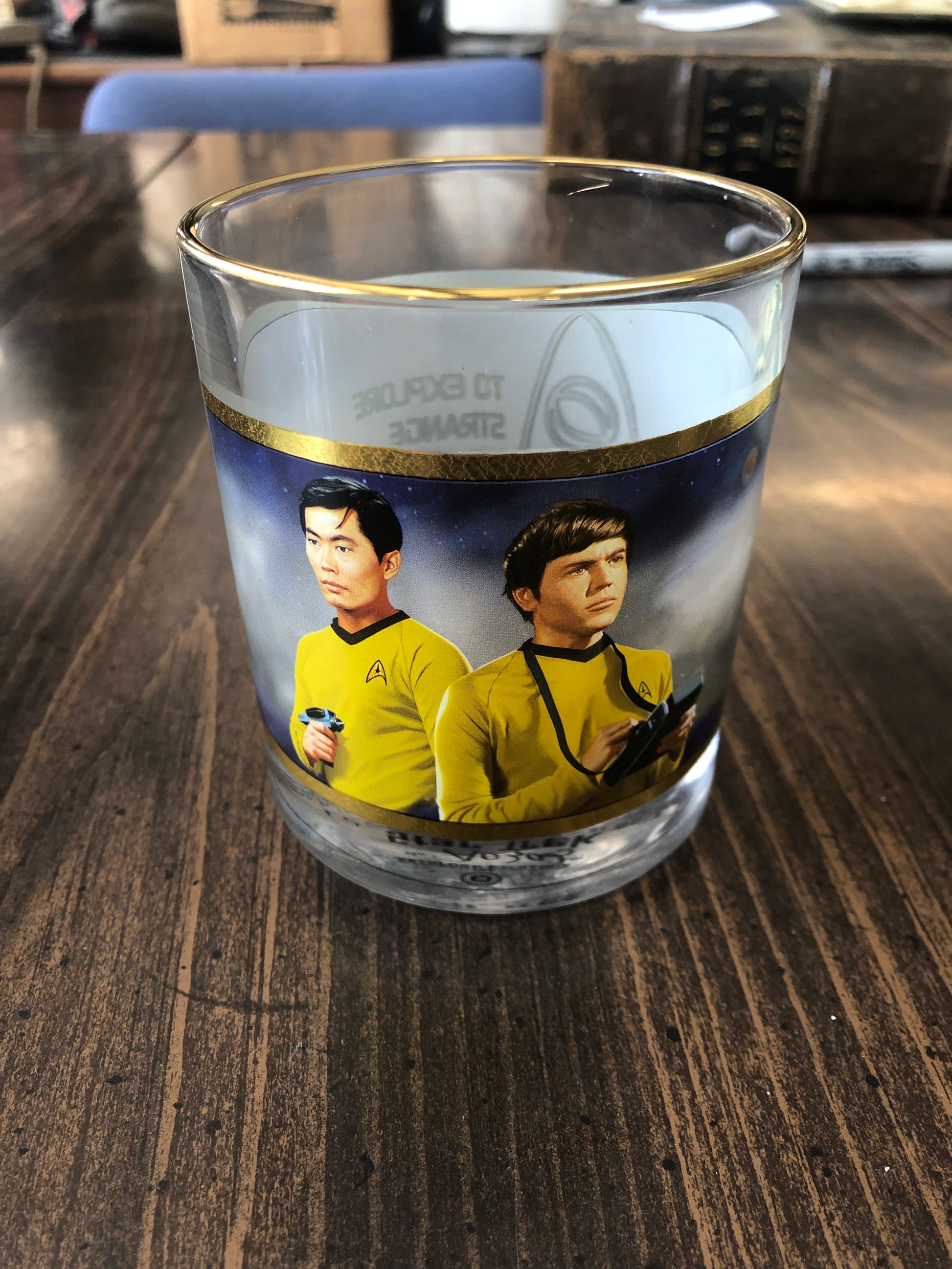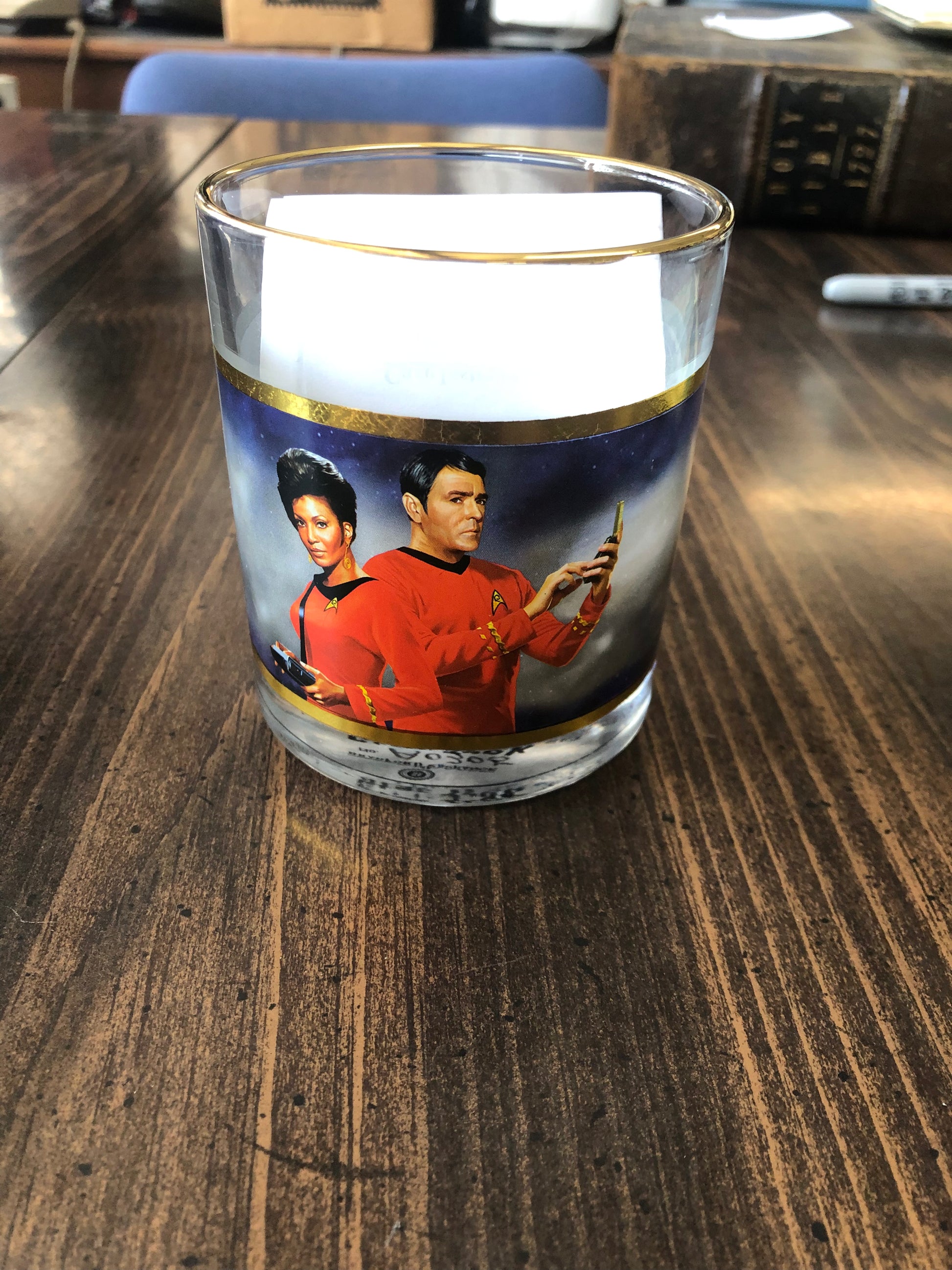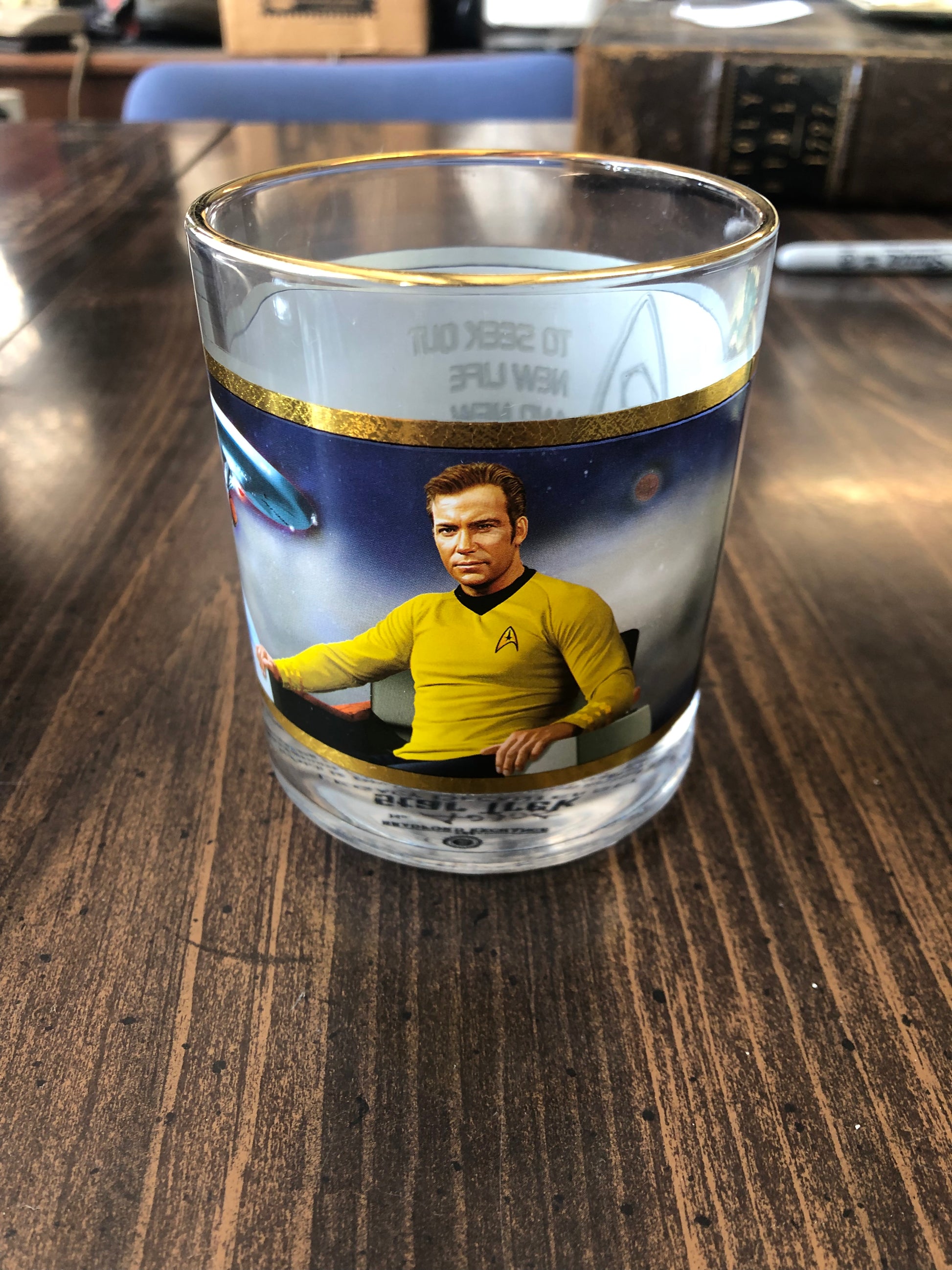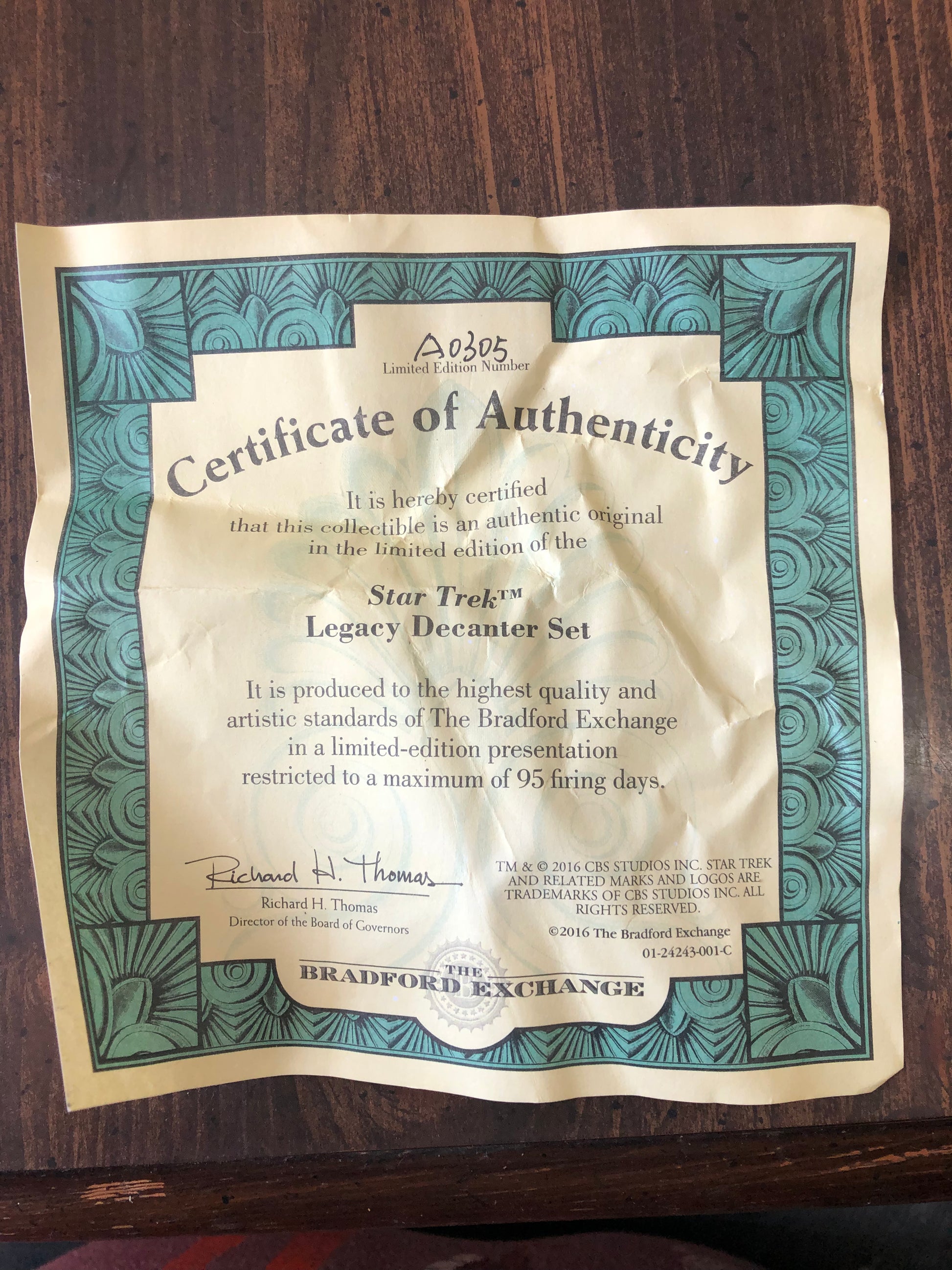 Including four 10oz. crystal glasses depicting the valiant crew of the Star Ship Enterprise and a 24oz decanter with an image of the ship herself and a stopper in the image of the classic Federation insignia.