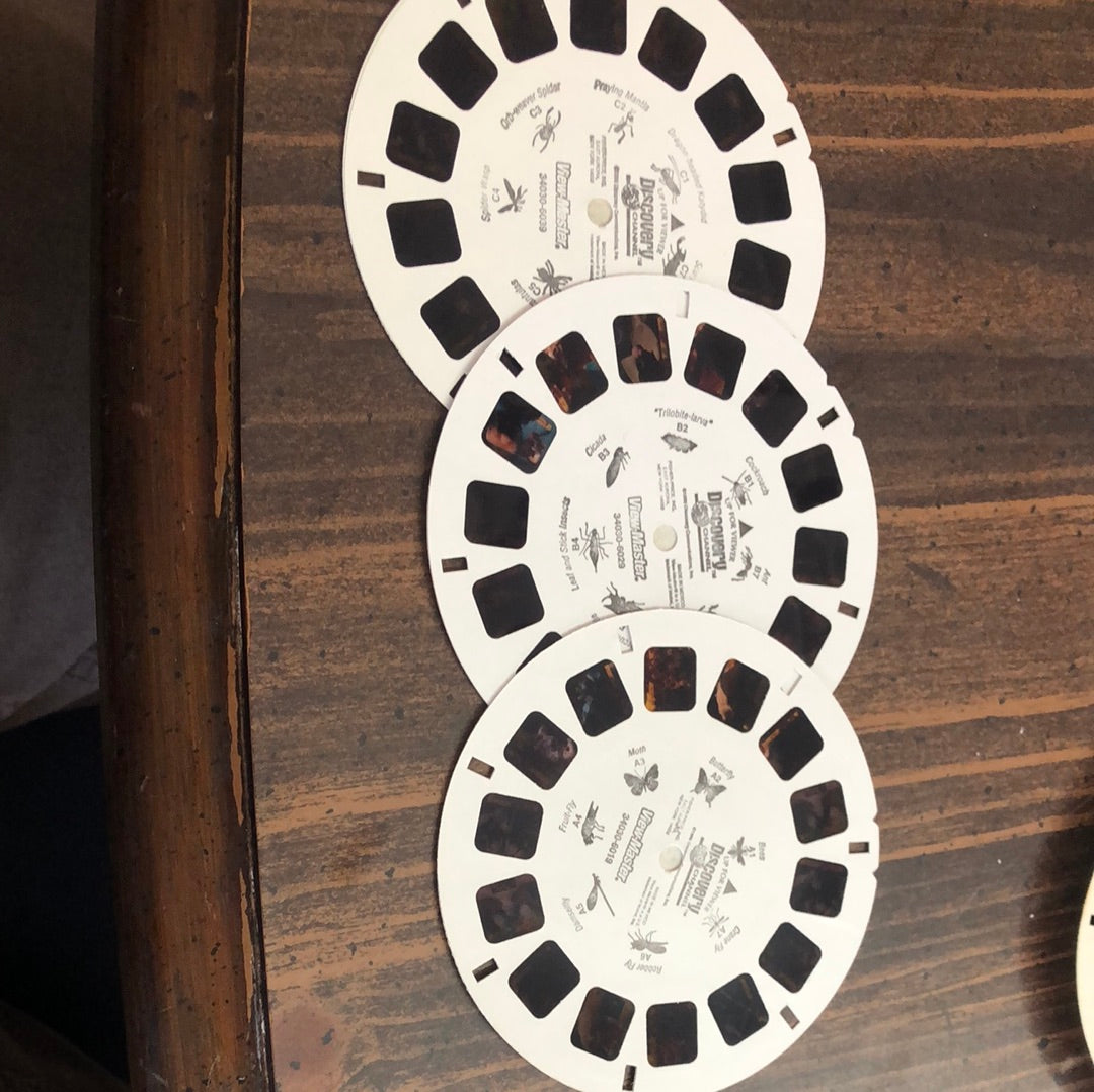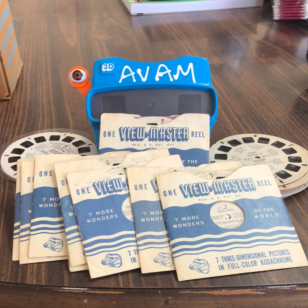 Most reels missing a cover; View-Master unit has ‘AVAM’ painted in the front and fake eyes glued to the slide