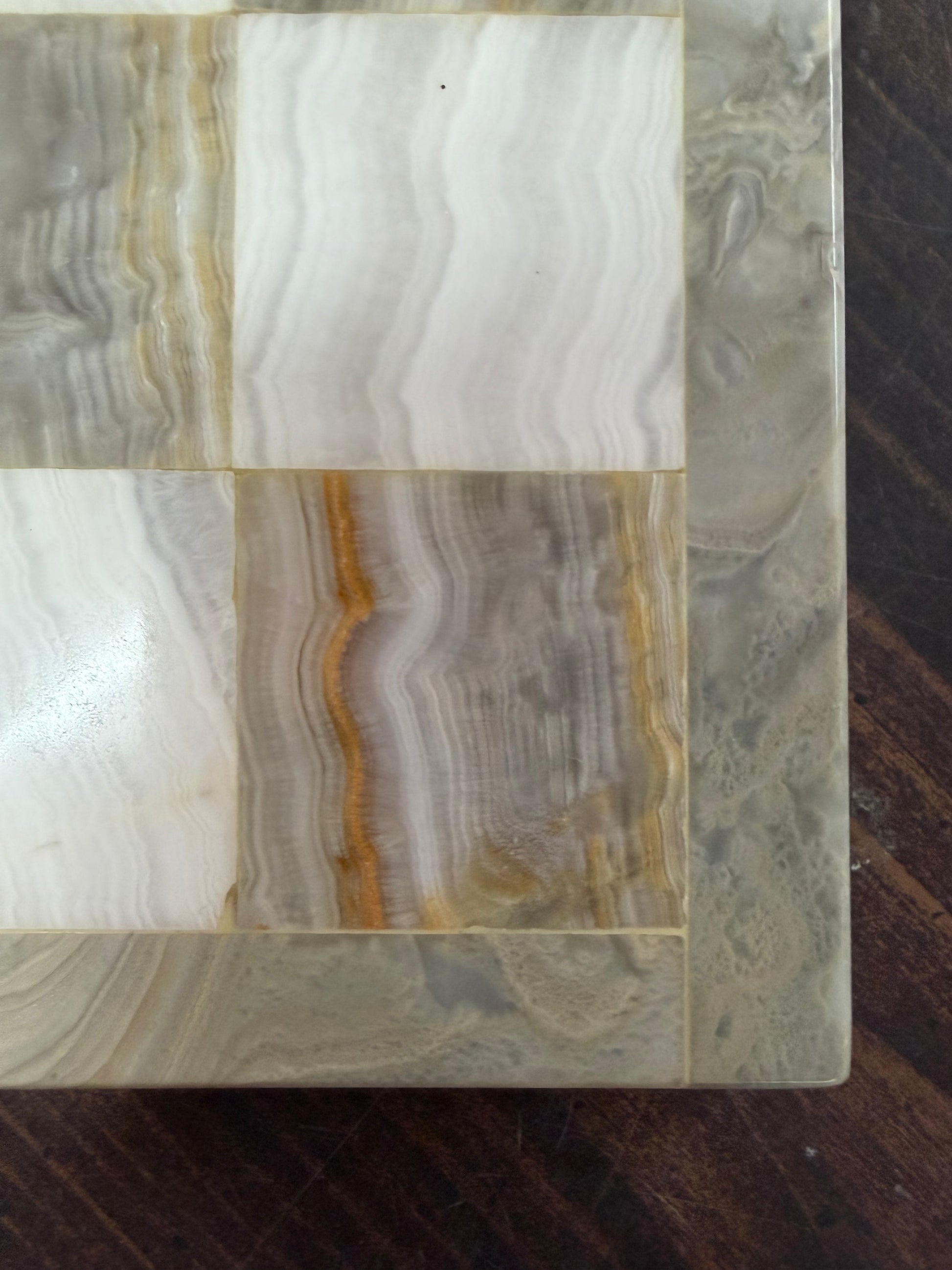 Authentic vintage Mexican chess set hand-carved from marble and onyx, featuring intricate Aztec-inspired figures in contrasting white and brown stone. Each piece showcases natural variations and skilled craftsmanship, making every set unique. A striking collectible that doubles as a playable chess set and an eye-catching display piece. Note - board is cracked, could be fixed with superglue. Board is ~14" by 14".