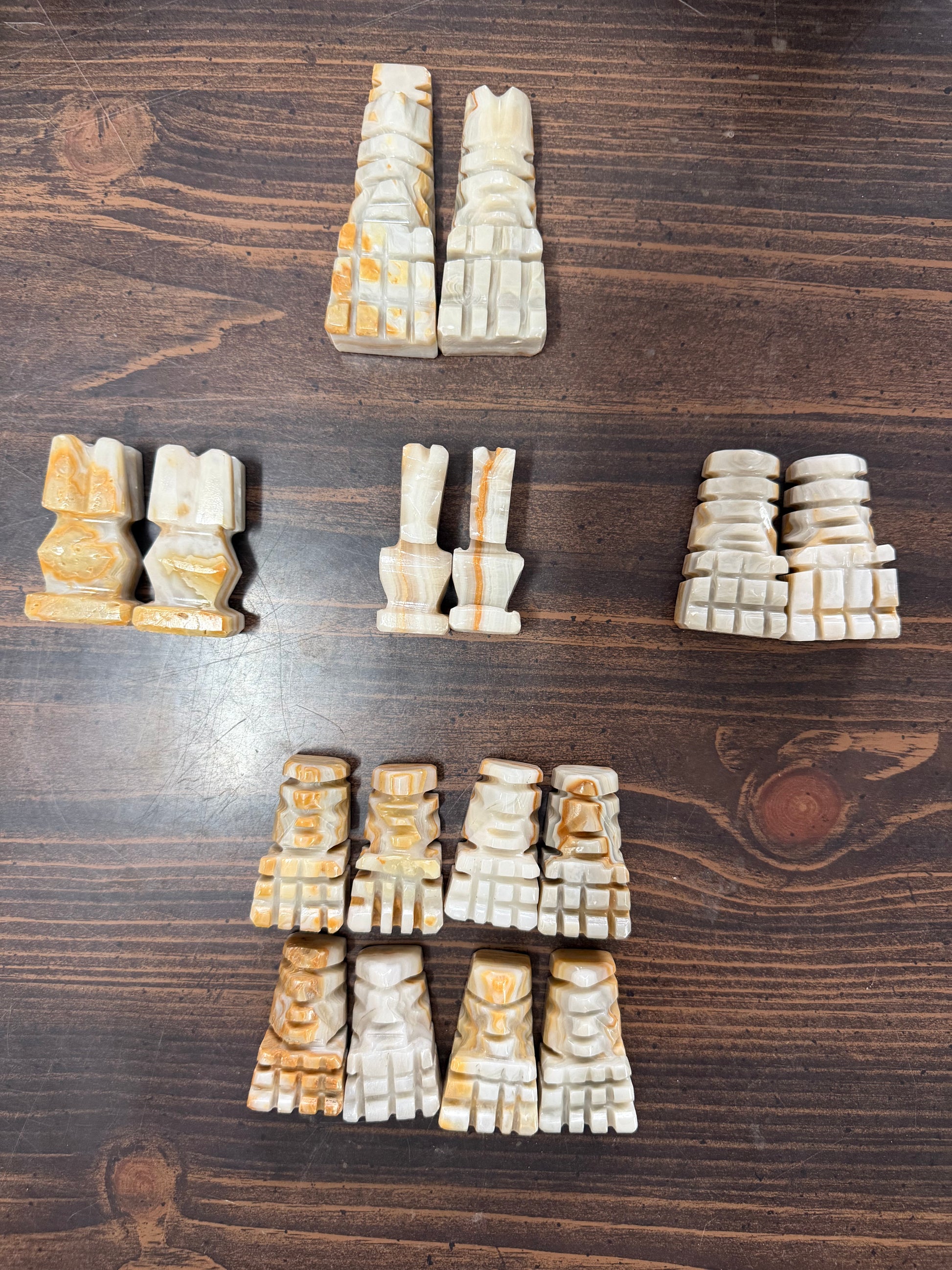 Vintage Mexican Marble & Onyx Hand-Carved Aztec Chess Set — White & Brown