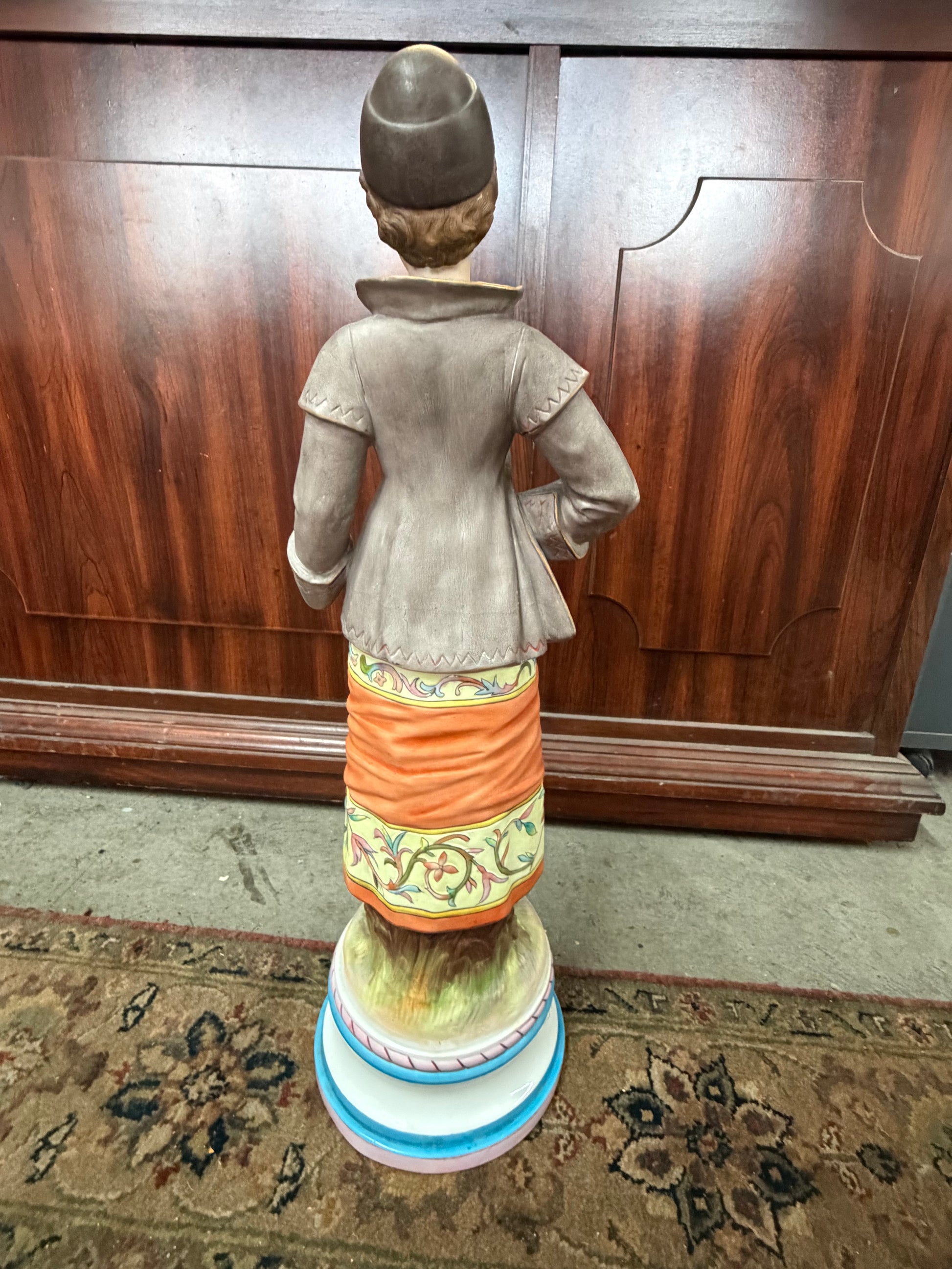 Delicate vintage porcelain figurine featuring a gracefully posed woman in an elegant dress. Finely detailed with soft colors, this decorative piece adds classic charm to shelves, mantels, or curio cabinets. A timeless accent perfect for collectors of porcelain art or traditional décor. About 18-20" tall.