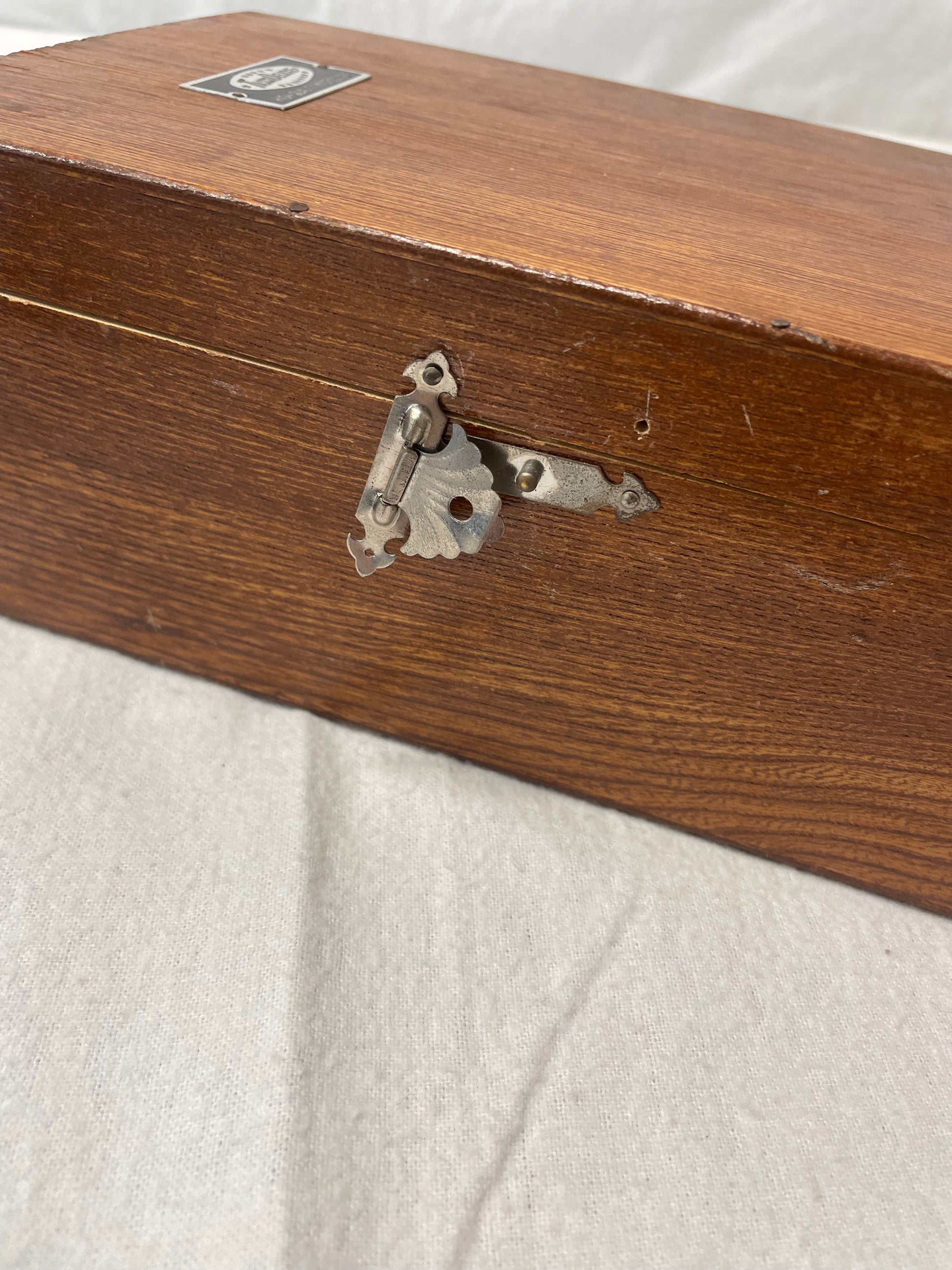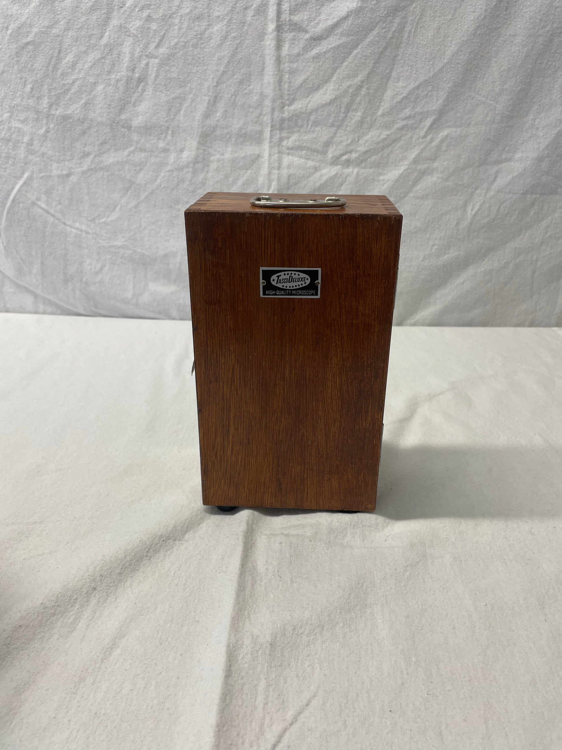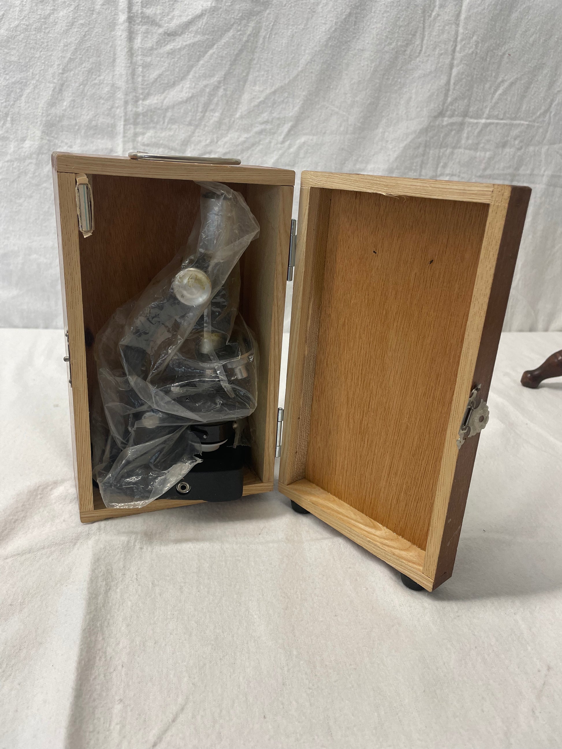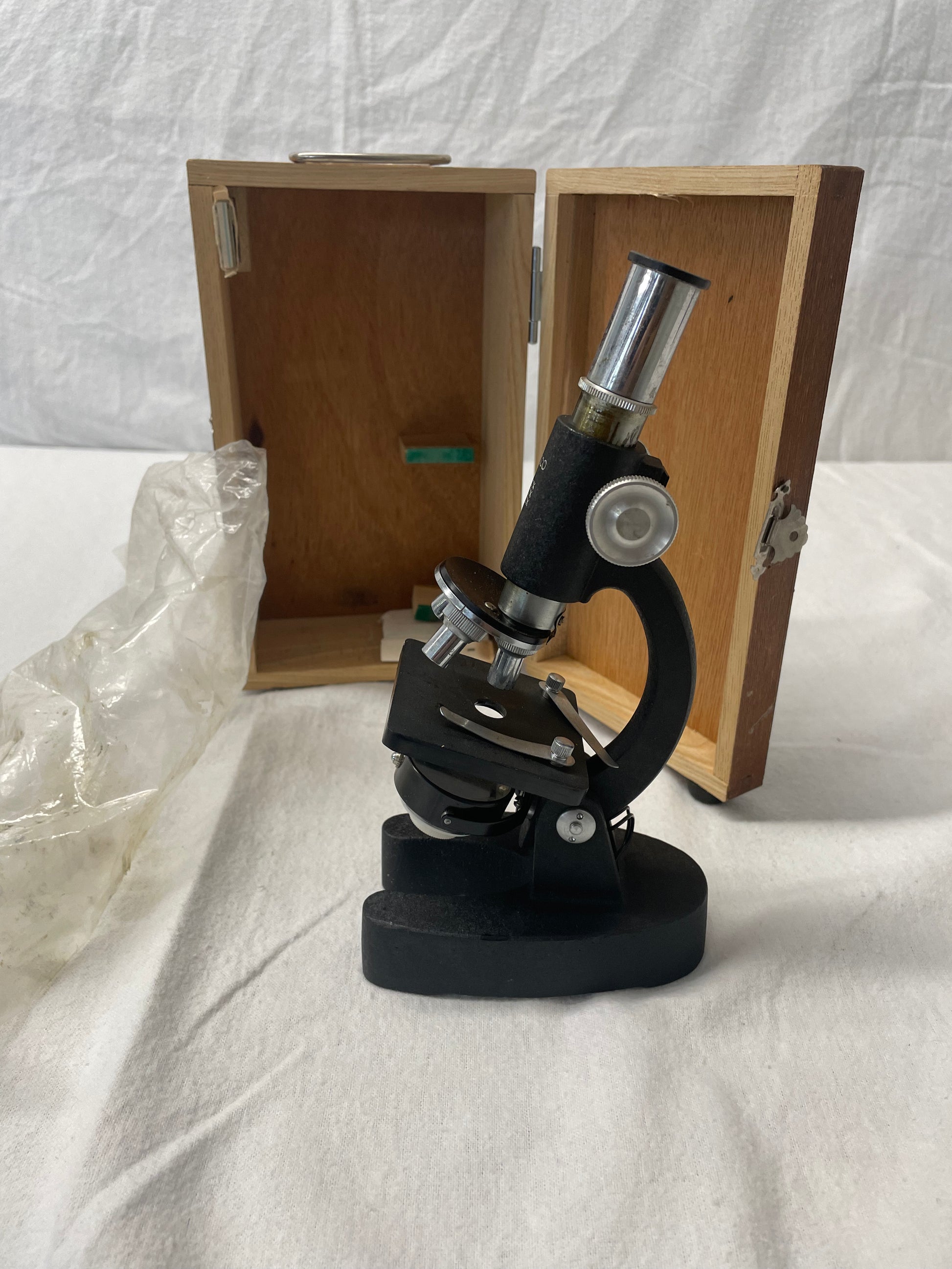Vintage 1950's to 1960's era student microscope with 3 volt lamp (light bulb is burnt out). In good condition, the microscope itself is still wrapped in plastic and the wooden carry case isn't in terrible shape, a few scratches on the box and the clasp is broken, just needs a new finishing nail put in.