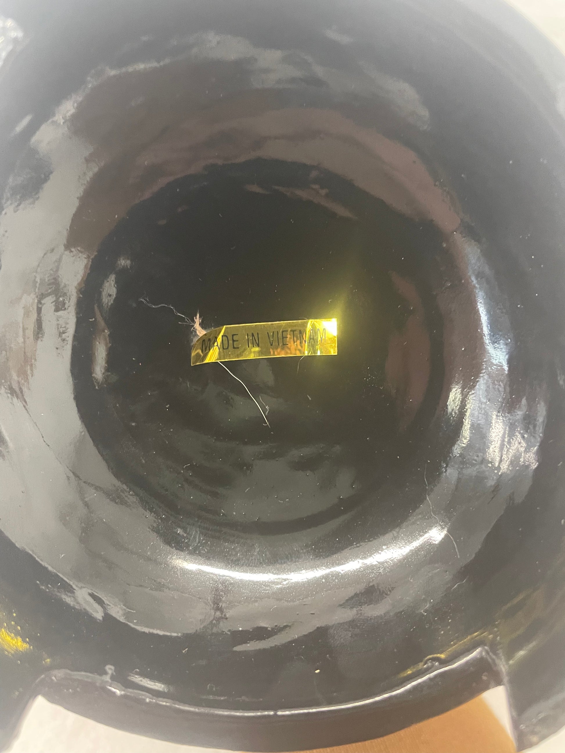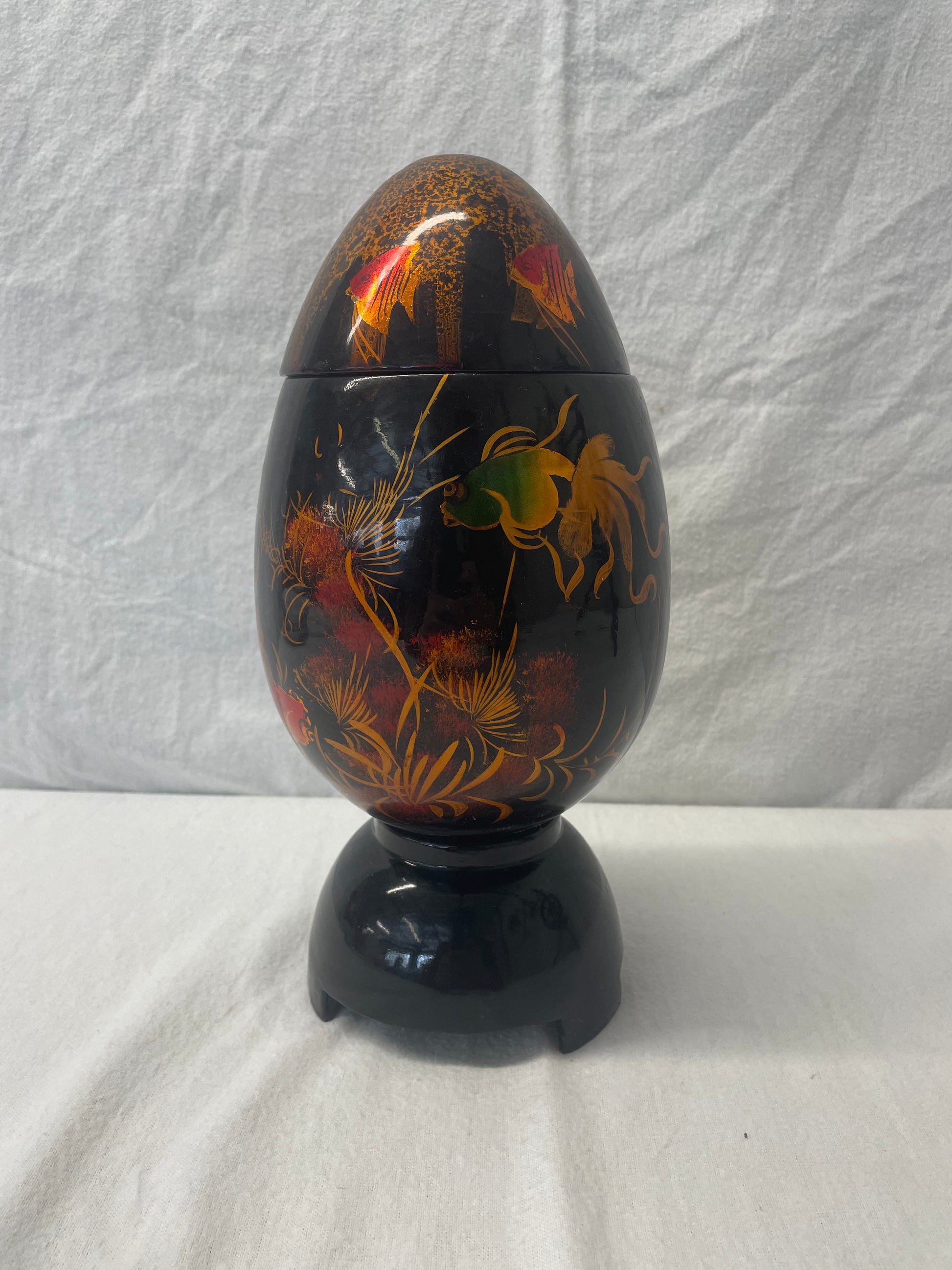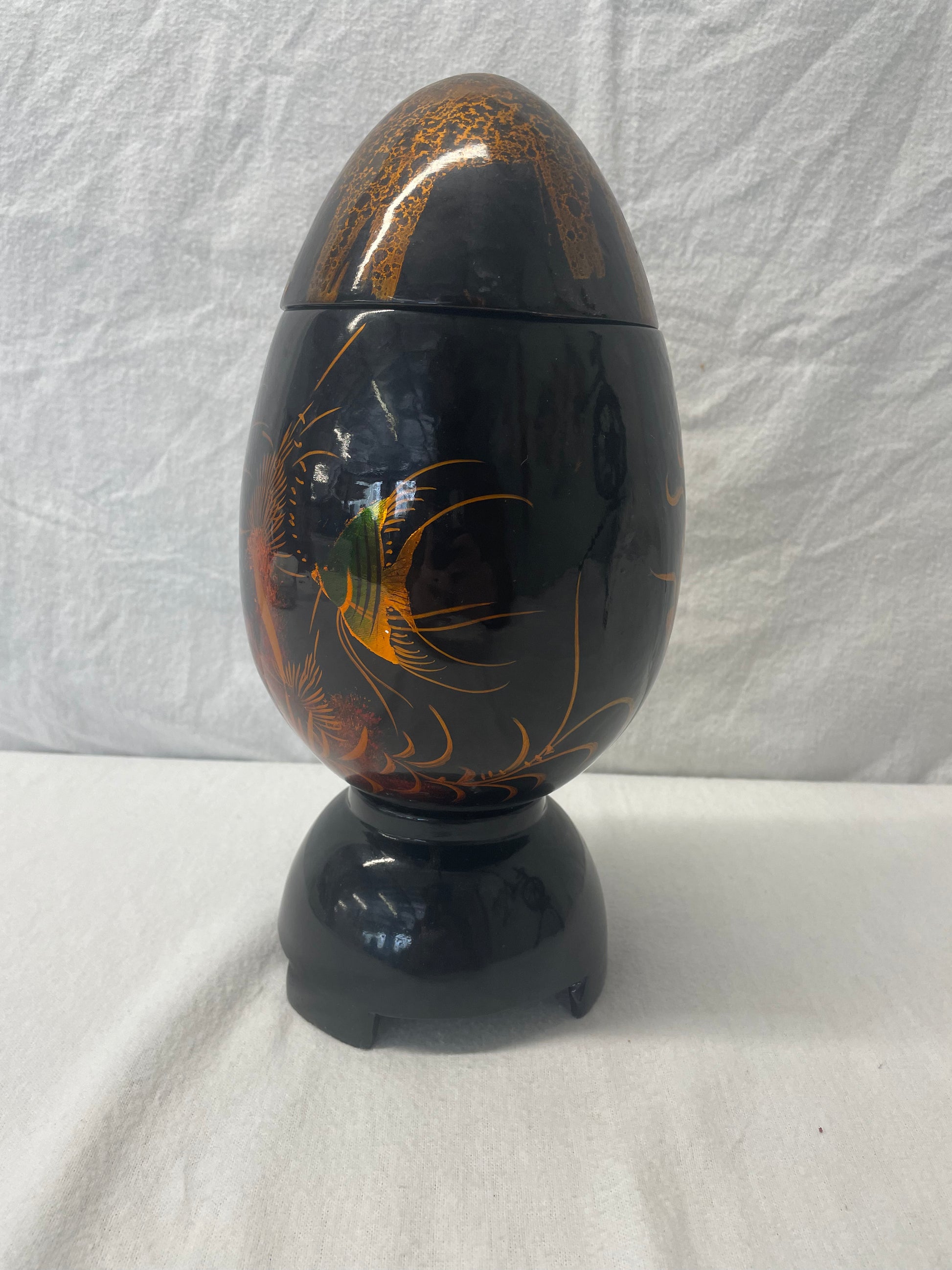 Hand-painted lacquerware egg shaped wooden storage box painted with angelfish design painted on the outside. Gorgeous decorative storage piece made in Vietnam.