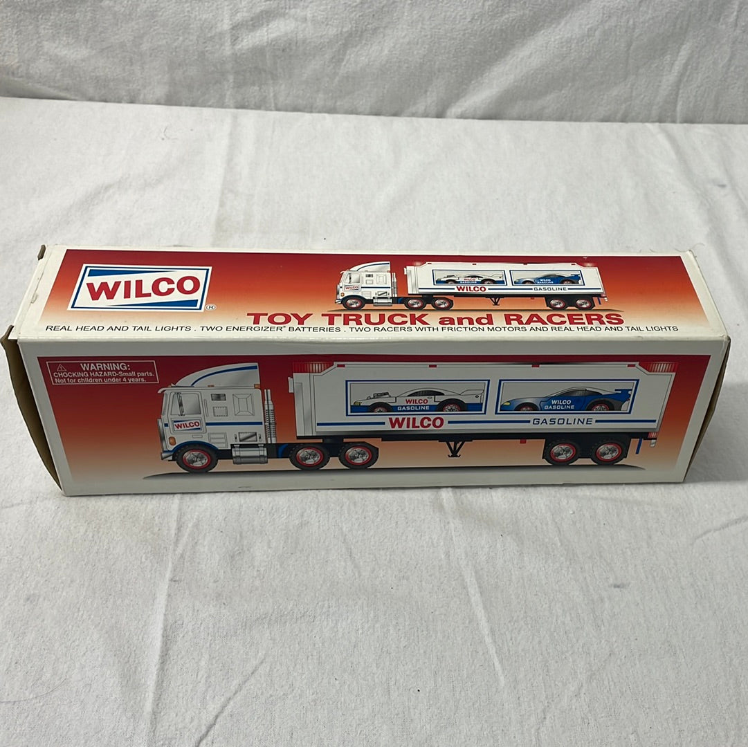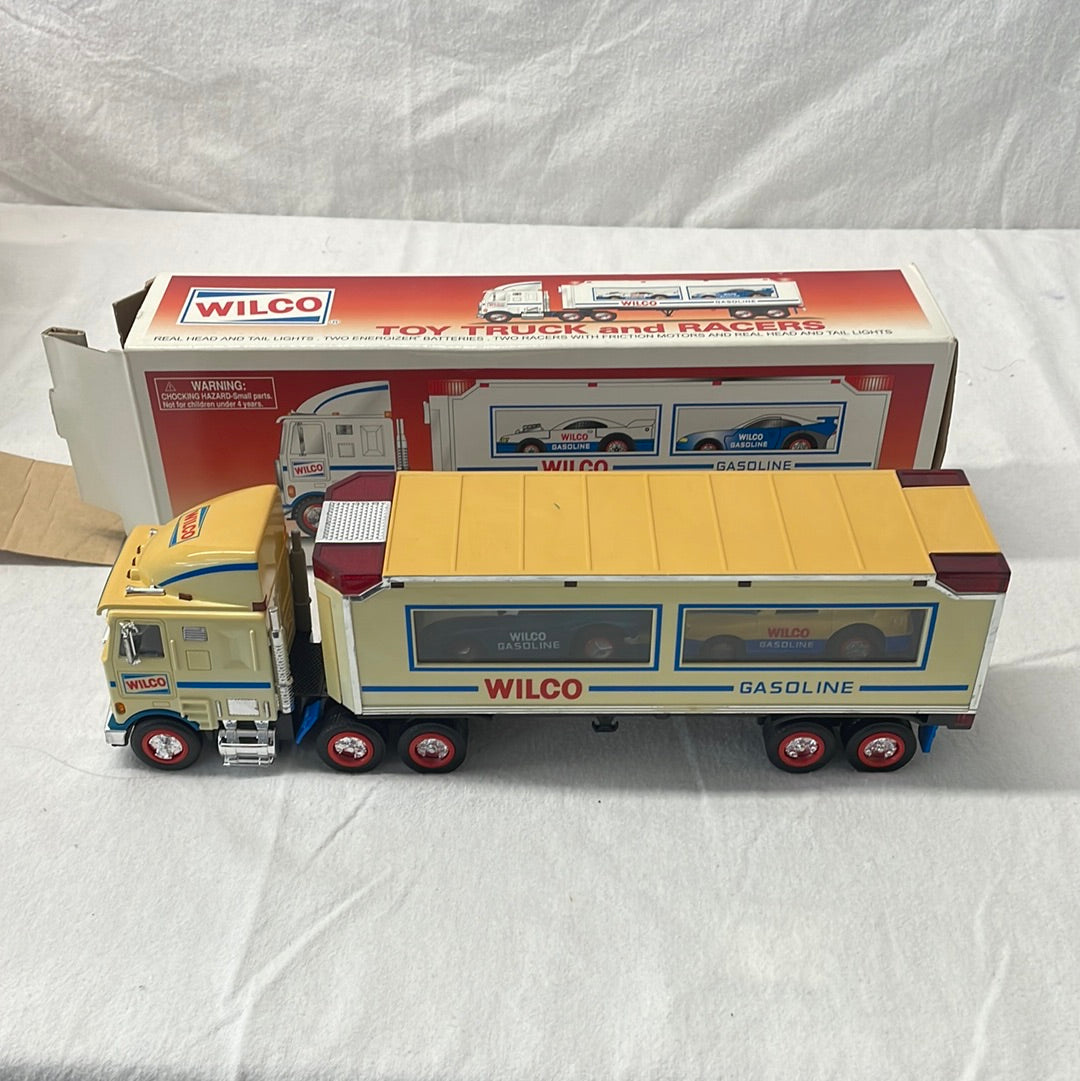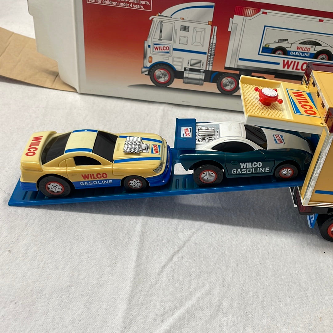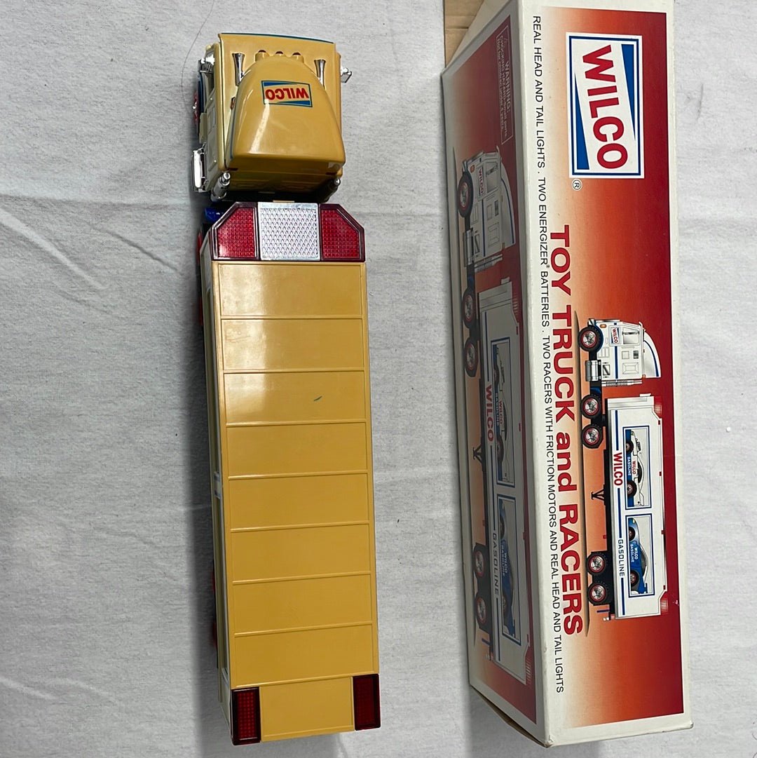 Wilco Toy Truck and Racers, real head and tail lights, batteries not included, very small blue mark on top of the truck, yellow plastic still in excellent condition. Original box included. Includes two "racers" cars with Friction Motors and real head and tail lights. Vintage from 1998