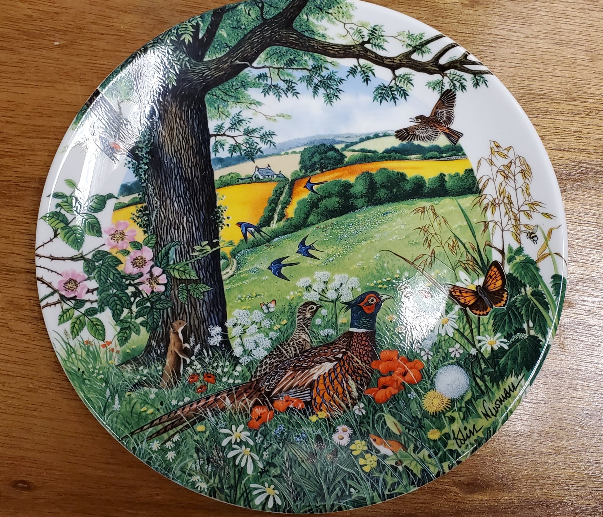 Wedgwood "Meadows and Wheatfields" Collectible Plate. With frame. "Meadows and Wheatfields" is the first plate in the "Country Panorama" series of plates by artist Colin Newman and Wedgwood Limited Edition Plates. This plate is from a limited edition of 150 firing days. Made in 1987.