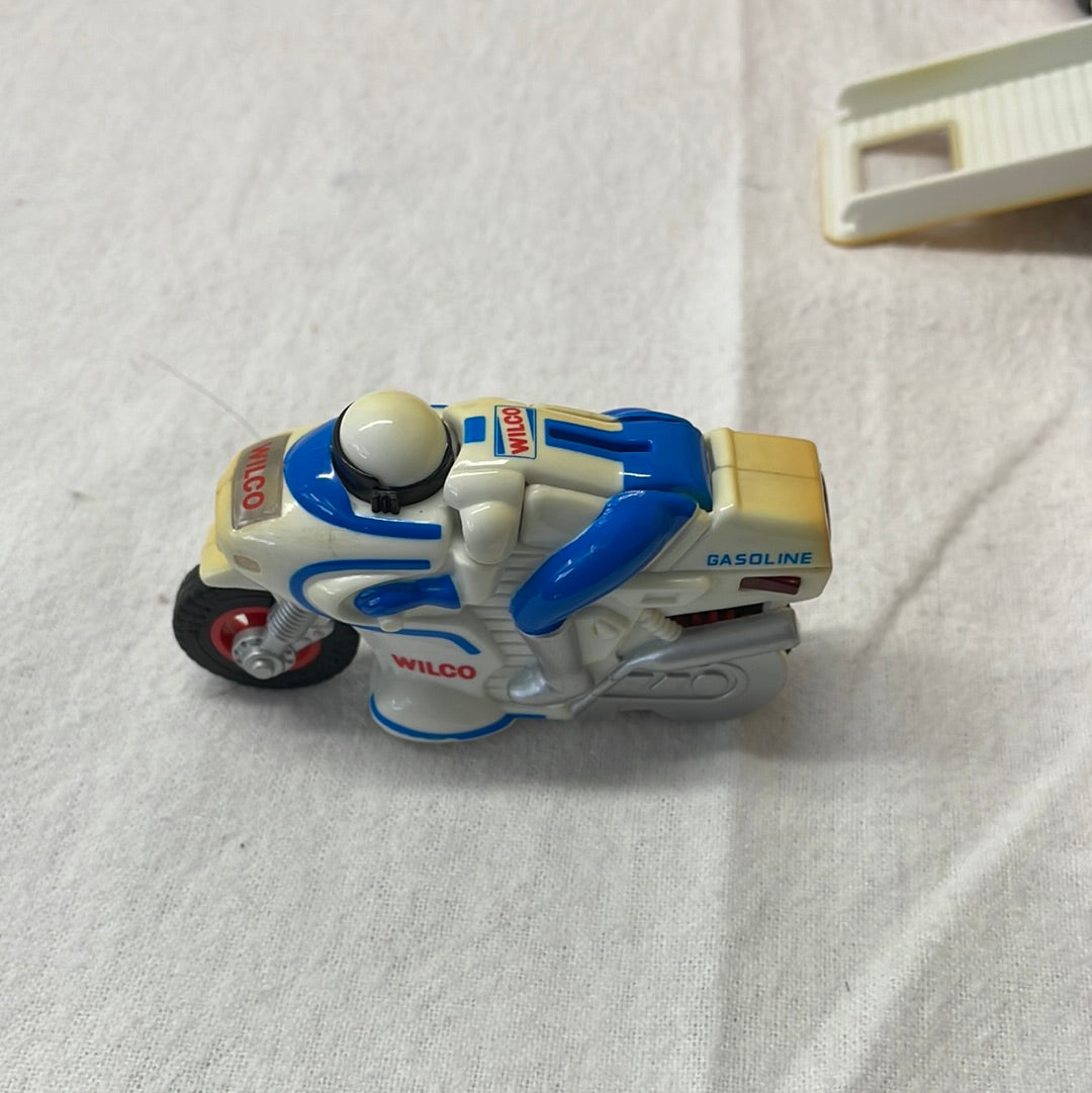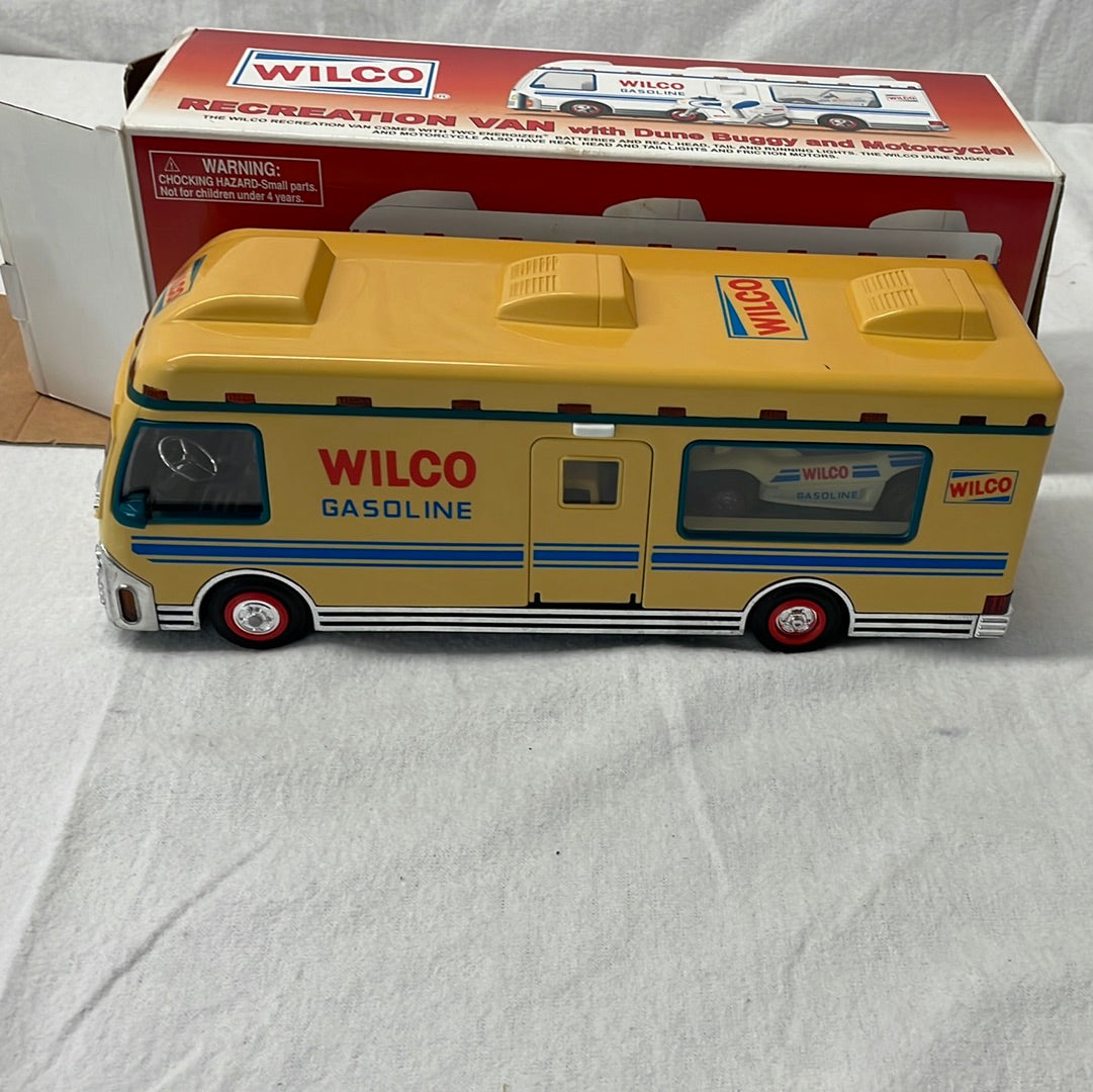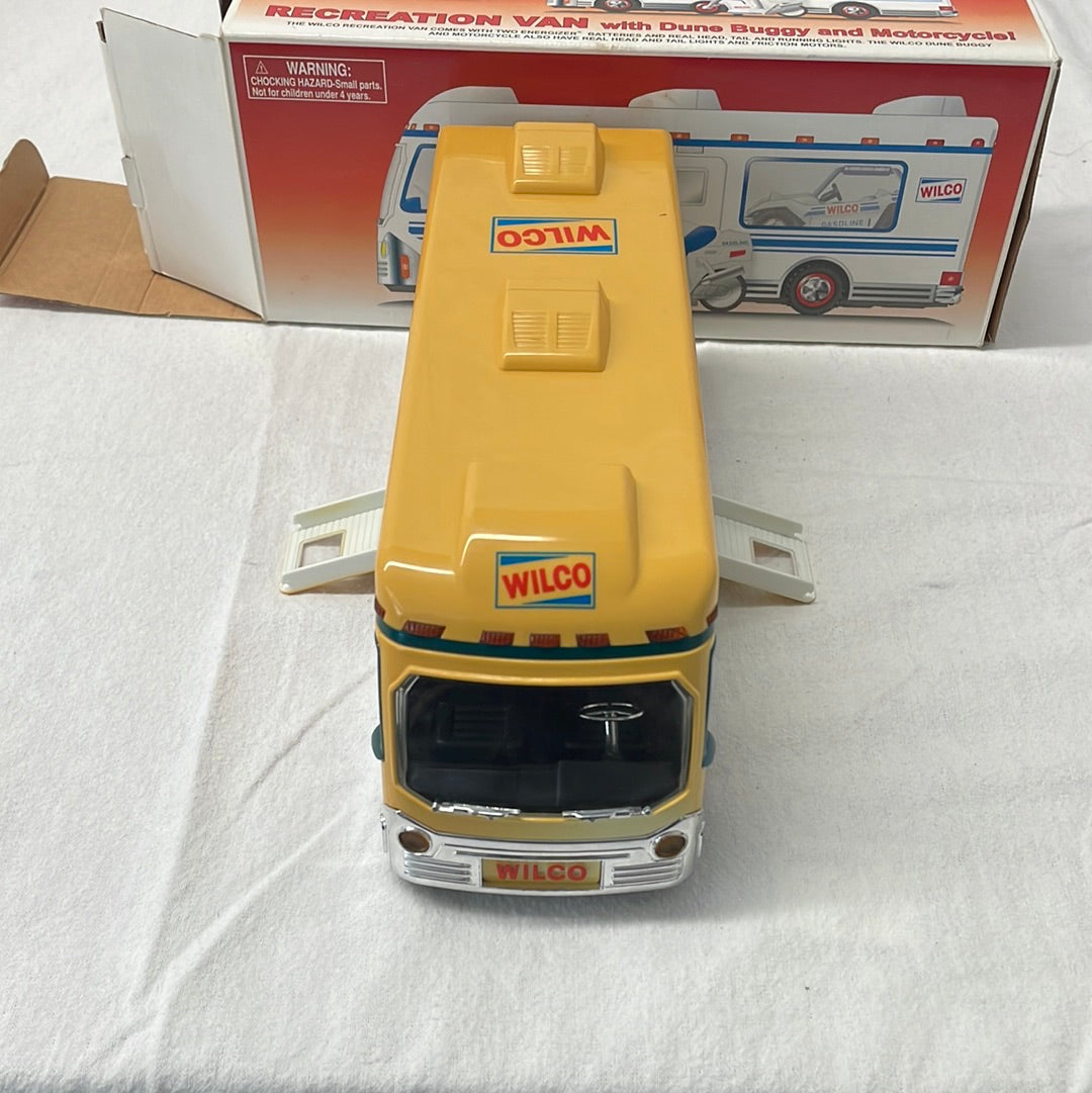 Vintage from 1999, this Wilco Recreation van with a dune buggy and a motorcycle, lights on dune buggy and van turn on, the van's lights are very faint. Batteries included, tested and working. Yellow plastic on the van, the motorcycle and dune buggy were white plastic but have yellowed in some areas with age. The front of the van is very mildly faded.